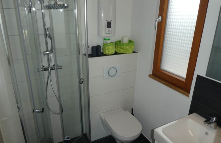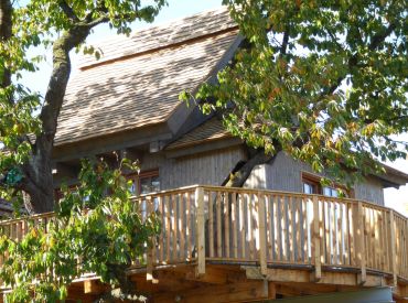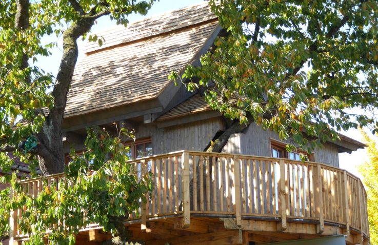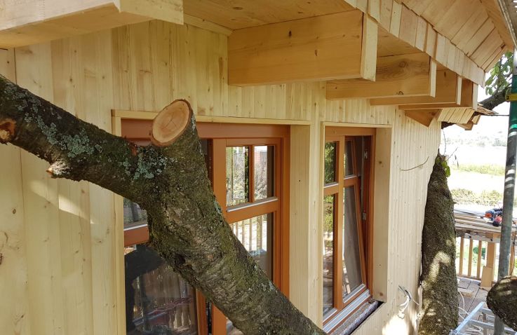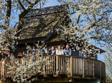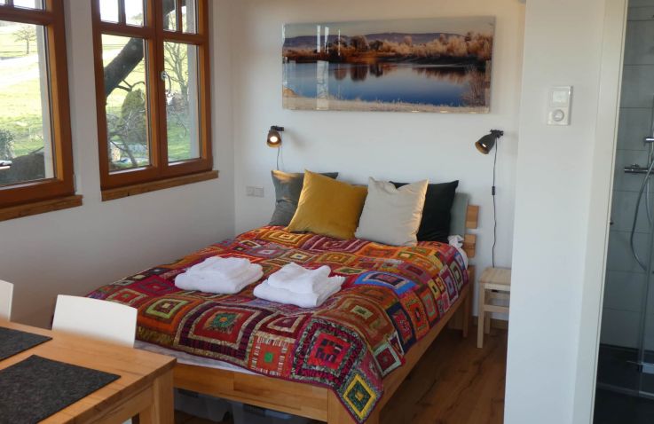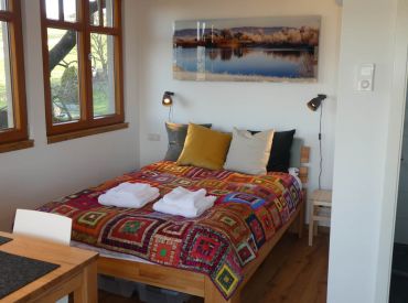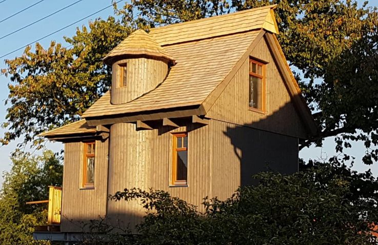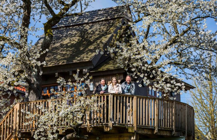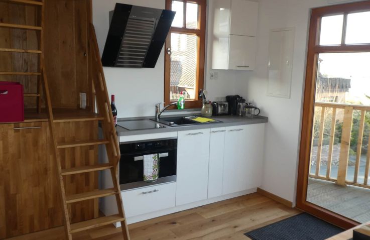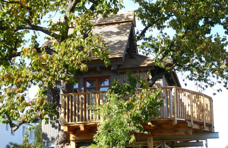 Gebaut wurde das Haus in und um einen alten Kirschbaum herum, ohne diesen zu belasten: Es ist aufgeständert, in Holzständerbauweise errichtet und steht auf Schraubfundamenten, um die Baumwurzeln zu schützen. Das Baumhaus erreichst du über eine bequeme, breite Treppe. Innen erwartet dich eine moderne, hochwertige und allergikerfreundliche Ausstattung. Im unteren Wohn- und Schlafbereich findest du eine Küchenzeile mit Herd und Kühlschrank, einen Essbereich, ein großes Doppelbett sowie ein Bad mit Dusche und WC. Über eine sichere und gut begehbare Stiege gelangst du in den oberen Schlafbereich im Spitzboden mit einem weiteren Doppelbett; ein Kinderschutzgitter sorgt hier für zusätzliche Sicherheit. Freies WLAN und ein Telefon sind vorhanden, auf weitere mediale Ablenkung wurde bewusst verzichtet. Geheizt wird mit modernen Infrarot-Flächenheizungen.