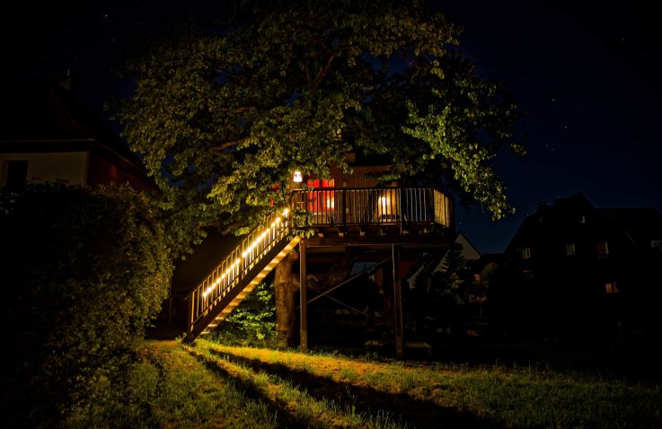 Du suchst eine besondere Unterkunft und möchtest der Hektik des Alltags entfliehen? Dann erwartet dich ein wunderschönes Baumhaus in luftiger Höhe, mitten im Weserbergland, vis-à-vis der einzigartigen Auenlandschaft Hohenrode in einer Weserschleife. Hier erlebst du Natur pur, kannst Seevögel beobachten und mit etwas Glück sogar einem Seeadler beim Fischen zusehen.