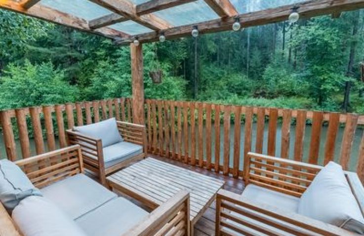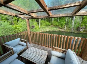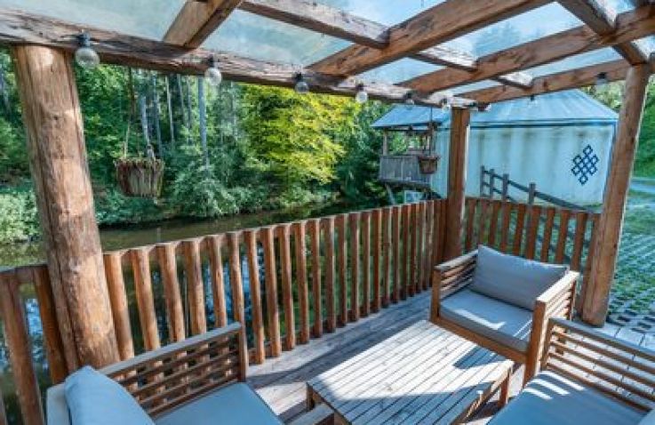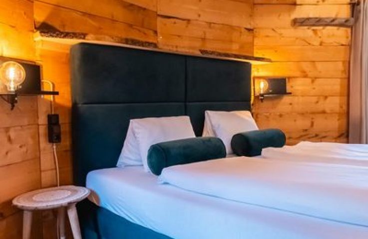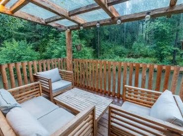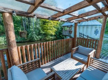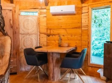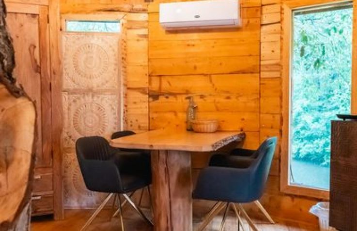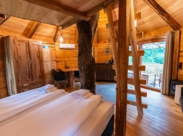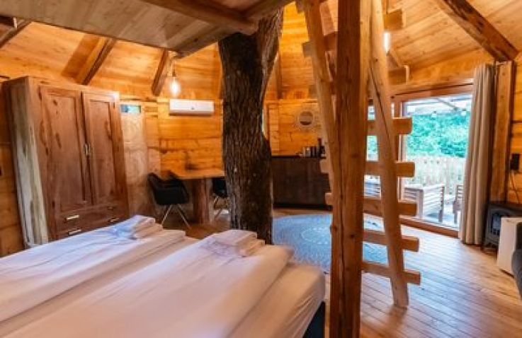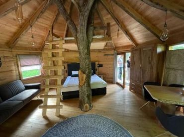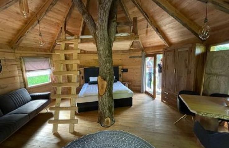 Das Treehouse 2+2 ist ein gemütliches Baumhaus für bis zu 4 Personen mit einer außergewöhnlichen runden Bauweise und einem großen Baumstamm in der Mitte. Im Erdgeschoss findest du ein komfortables Doppelbett, ein gemütliches Sofa, einen Fernseher und einen Esstisch – perfekt für gesellige Abende. Über eine Leiter erreichst du den Schlafboden im oberen Bereich, wo ein weiteres Doppelbett auf dich wartet. Die clevere Raumaufteilung schafft eine einzigartige, naturverbundene Atmosphäre.