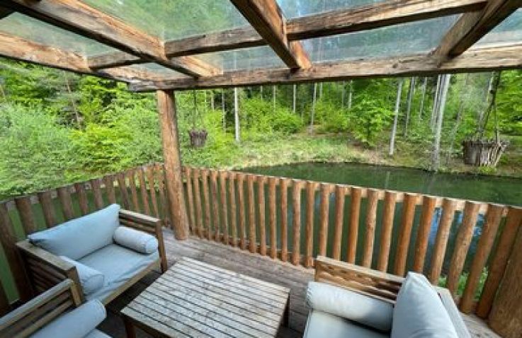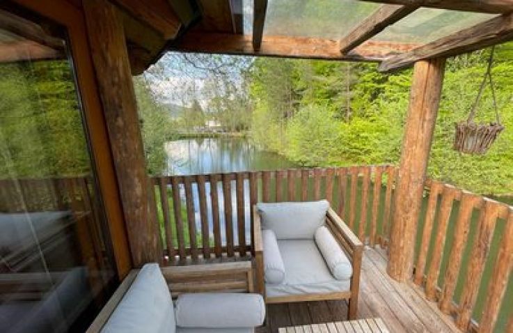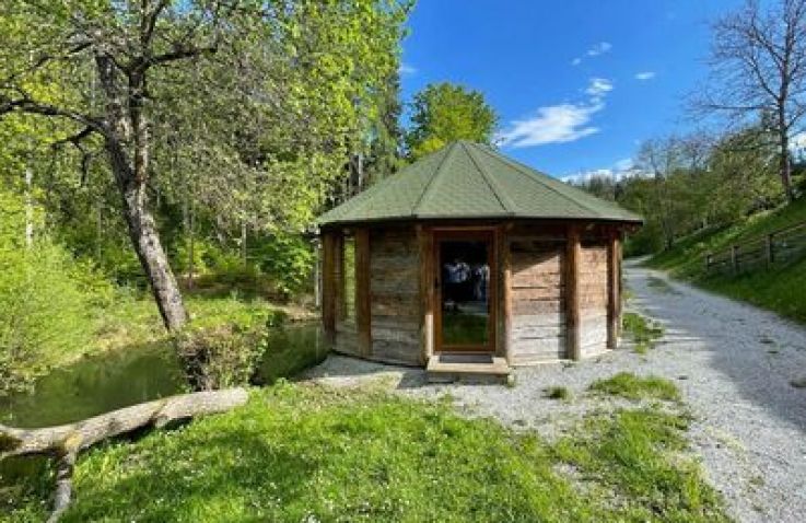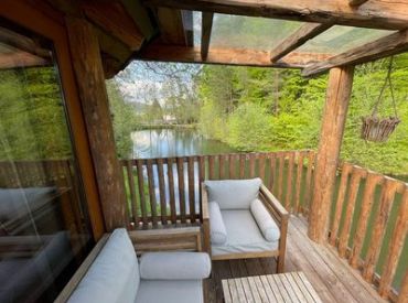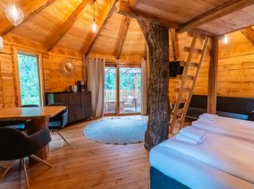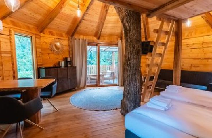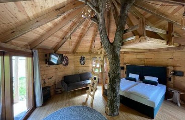 Außergewöhnliches Baumhaus-Erlebnis am Wörthersee – perfekt für kleine Familien oder zwei Paare, die Abenteuer und Natur lieben. Das runde Holzhäuschen mit seinem markanten Baumstamm in der Mitte bietet ein einzigartiges Übernachtungserlebnis, nur 500 Meter vom kristallklaren See entfernt.