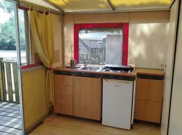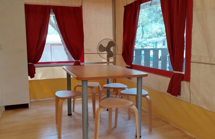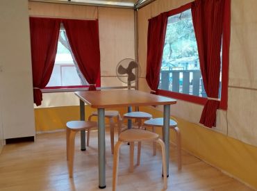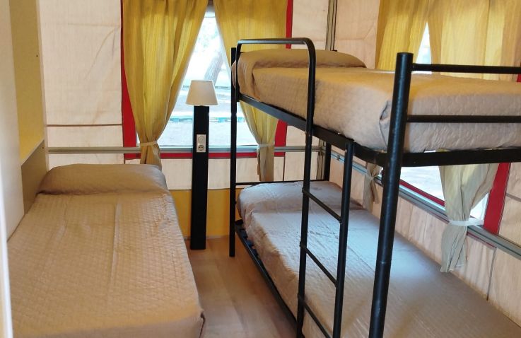 Das Bella Lodge Tent ist ein komfortables Lodgezelt für bis zu 5 Personen auf 28 m² und 3 Räumen. In 2 Schlafzimmern schlafen alle entspannt: Schlafzimmer 1 mit einem Doppelbett, Schlafzimmer 2 mit 2 Einzelbetten – Kopfkissen und Wolldecken sind inklusive. Das private Badezimmer mit WC, Waschbecken und Dusche befindet sich in der Unterkunft. Die Küche ist in den kombinierten Wohn- und Essbereich integriert und verfügt über Kühlschrank mit Gefrierfach, Herd und Grundküchenausstattung. Eine Terrasse mit Gartenmöbeln gehört dazu. Bettwäsche und Handtücher können gegen Aufpreis gemietet werden. Haustiere sind willkommen.