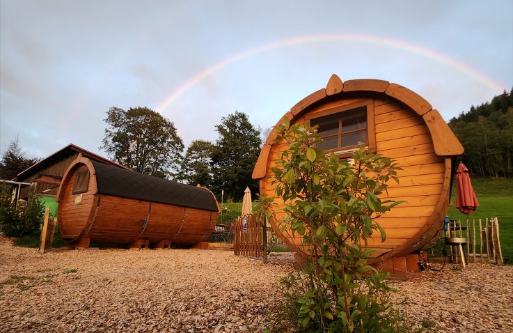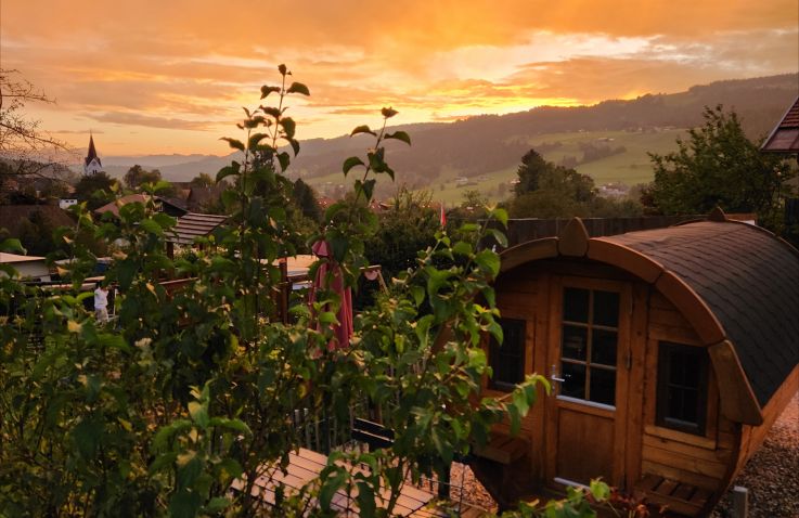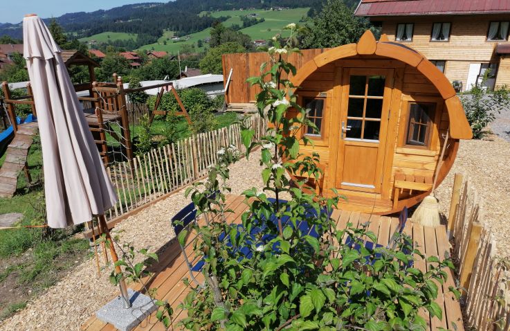 Die idyllische Premiumlage, direkt an einer Bergwiese mit original Allgäuer Kühen und deren ikonischem Glockenklang gelegen, bestechen die Schlaffässer von Camping-Aach mit einem fantastischem Ausblick auf den Bregenzerwald bis hin zum Säntis. Die Lage und Gestaltung dieser Holzfässer sind so überzeugend, dass sie 2023 sogar mit dem CampsiteAward ausgezeichnet wurden!