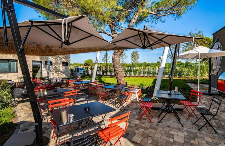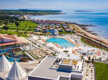Die Poollandschaft von Camping Arena Grand Kaela ist das Herzstück des Resorts: Mehrere großzügige Außenpools mit spektakulärer Wasserrutsche und separatem Kleinkindbecken mit Pilz-Wasserfällen versprechen Wasserspaß für alle Altersgruppen. Der direkte Zugang zum langen Kieselstrand an der Adria mit kristallklarem Wasser bietet unzählige Möglichkeiten zum Sonnenbaden, Schwimmen und Entspannen mit Meerblick.