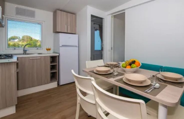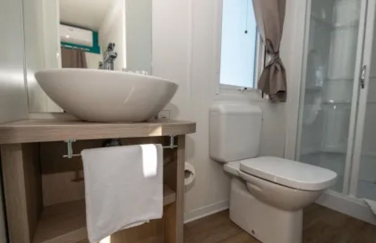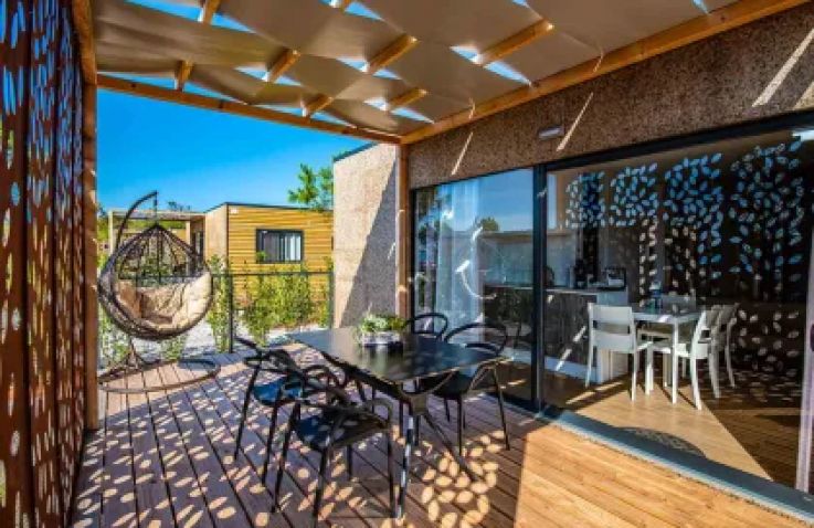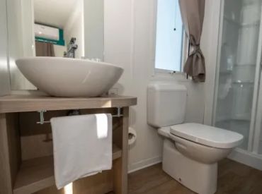 Die Camping Home Green (37 m² Wohnfläche plus 25 m² möblierte Terrasse) besticht durch ihr großzügiges Raumangebot und die moderne Einrichtung. Mit Klimaanlage, zwei Schlafzimmern, zwei Badezimmern mit Dusche sowie einer vollausgestatteten Kitchenette bietet sie allen Komfort für einen erholsamen Urlaub. Die geräumige Terrasse mit Essbereich ermöglicht direkten Zugang zum Strand und lädt zum entspannten Verweilen im Freien ein.