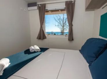 Die Camping Home Next First Row (30 m² Wohnfläche plus 20 m² möblierte Terrasse) liegt in erster Strandlinie und bietet atemberaubenden Meerblick. Diese klimatisierte Unterkunft verfügt über zwei Schlafzimmer (ein Doppelbett 160x190 cm, zwei Einzelbetten 80x190 cm), zwei moderne Badezimmer mit Dusche, eine vollausgestattete Kitchenette mit Induktionskochfeld, Mikrowelle und Kühlschrank sowie eine gemütliche Wohnzimmerecke mit Schlafcouch. Die private Terrasse mit Sonnenliegen und Hängesessel bietet direkten Strandzugang und uneingeschränkten Blick auf die Adria.