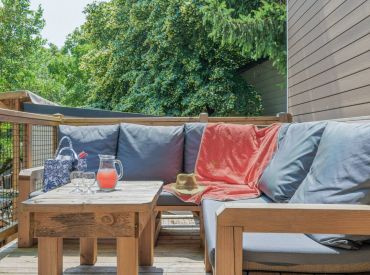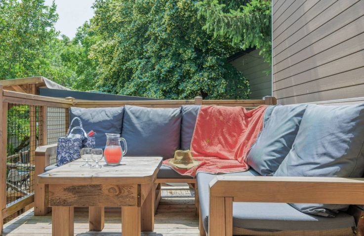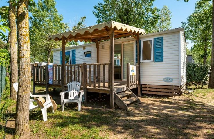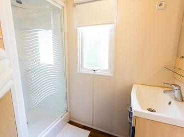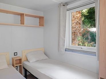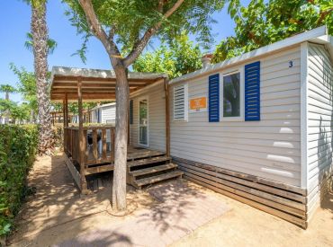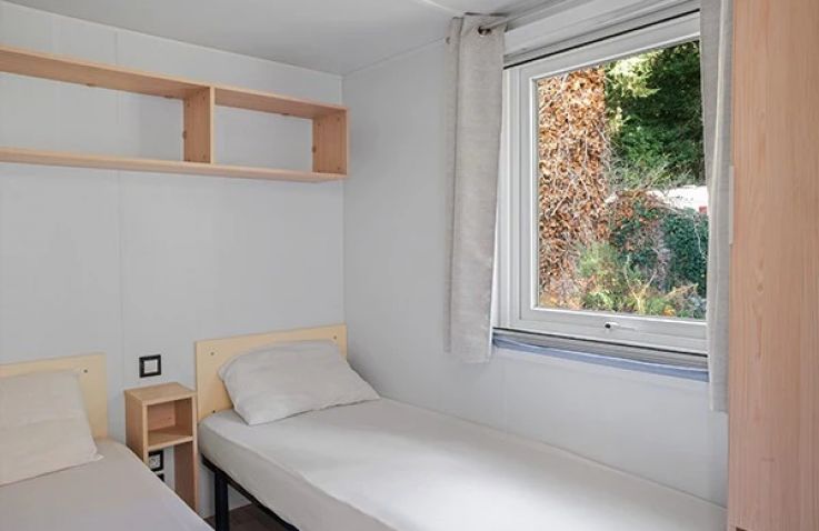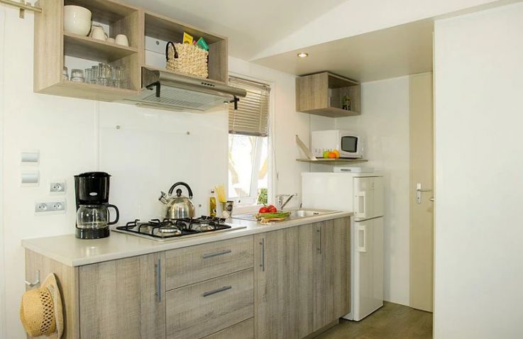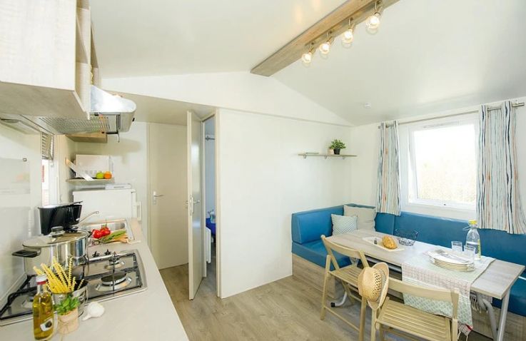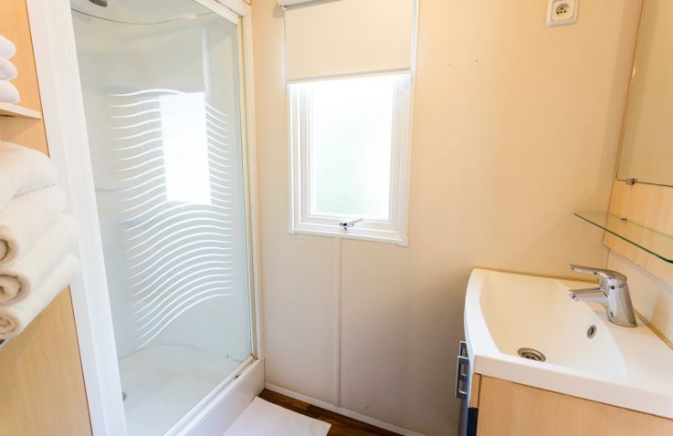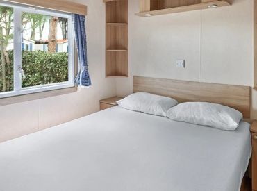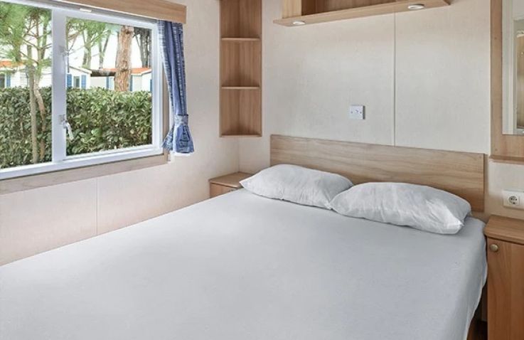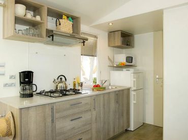 Das Classic Lounge Mobilheim bietet ebenfalls Platz für bis zu 4 Personen in 2 Schlafzimmern auf 24 m² und 3 Räumen: Schlafzimmer 1 mit einem Doppelbett, Schlafzimmer 2 mit 2 Einzelbetten. Kopfkissen und Bettdecken sind inklusive. Das eigene Badezimmer umfasst WC, Waschbecken und Dusche. Die Küche – ebenfalls im Wohnbereich integriert – ist etwas umfangreicher ausgestattet: Kühlschrank mit Gefrierfach, 4 Kochplatten, Filtermaschine, Wasserkocher und Mikrowelle. Eine Sofabank sowie Esstisch und Stühle im Wohnbereich bieten Wohnkomfort. Die teilweise oder vollständig gedeckte Holzterrasse mit Gartenmöbeln lädt zum Entspannen im Freien ein. Auch hier sind Haustiere leider nicht erlaubt.