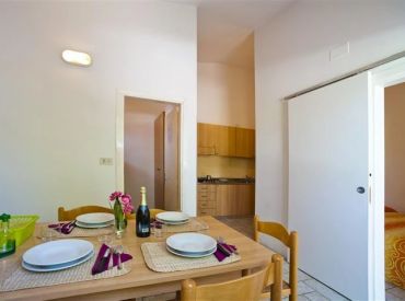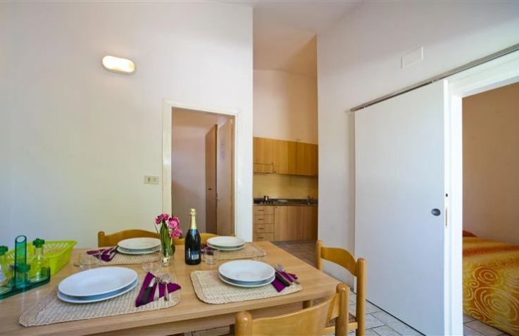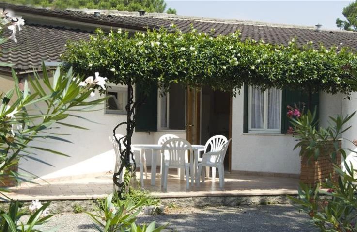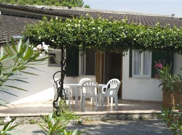 Der Zaffiro Bungalow ist eine kompakte Ferienunterkunft direkt auf dem Campinggelände für bis zu 4 Personen auf 25 m² und 3 Räumen. In 2 Schlafzimmern schlafen die Gäste komfortabel: Schlafzimmer 1 mit einem Doppelbett, Schlafzimmer 2 mit einem Etagenbett – Kopfkissen und Bettdecken sind vorhanden. Das private Badezimmer verfügt über WC, Waschbecken und Dusche. Die Küche ist in den kombinierten Wohn- und Essbereich integriert und bietet einen kleinen Kühlschrank mit Gefrierfach, 4-Gasbrenner-Herd und Grundküchenausstattung. Der Esstisch mit 4 Stühlen sowie die Steinterrasse mit Kunststoff-Gartenmöbeln runden die Ausstattung ab. Haustiere sind leider nicht erlaubt.