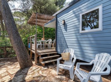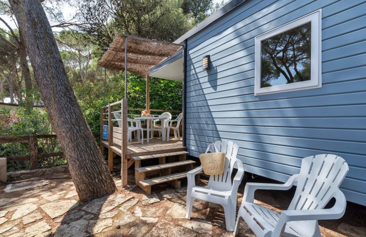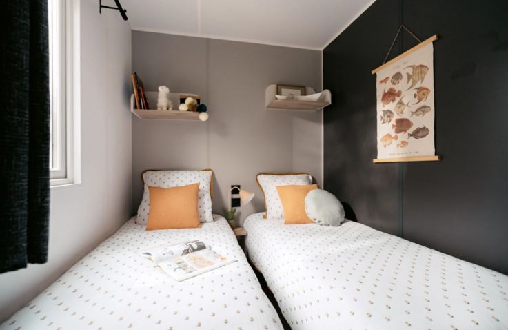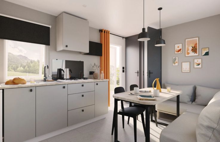 Das komfortable Mobilheim bietet Platz für 4 Personen auf 24 m² mit 3 Räumen und 2 Schlafzimmern. Das erste Schlafzimmer verfügt über ein Doppelbett, das zweite über 2 Einzelbetten – perfekt für Familien. Ein Badezimmer mit WC, Waschbecken und Dusche sowie ein Haarföhn bieten komfortablen Sanitärbereich. Der kombinierte Wohn- und Essbereich mit Esstisch und Stühlen lädt zum Entspannen ein. Die Küche ist Teil des Wohnraums und mit 4-Flammen-Gasbrenner, Kühlschrank mit Gefrierfach, Filtermaschine-Kaffeemaschine, Wasserkocher, Mikrowelle und Toaster ausgestattet – Grundausstattung ist vorhanden. Die Terrasse mit Gartenmöbeln bietet entspannten Outdoor-Bereich. Kopfkissen sowie Decken oder Bettdecken gehören zur Ausstattung. Das Mobilheim ist 0-3 Jahre alt.