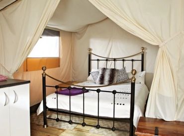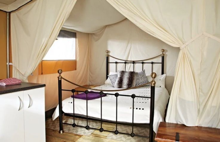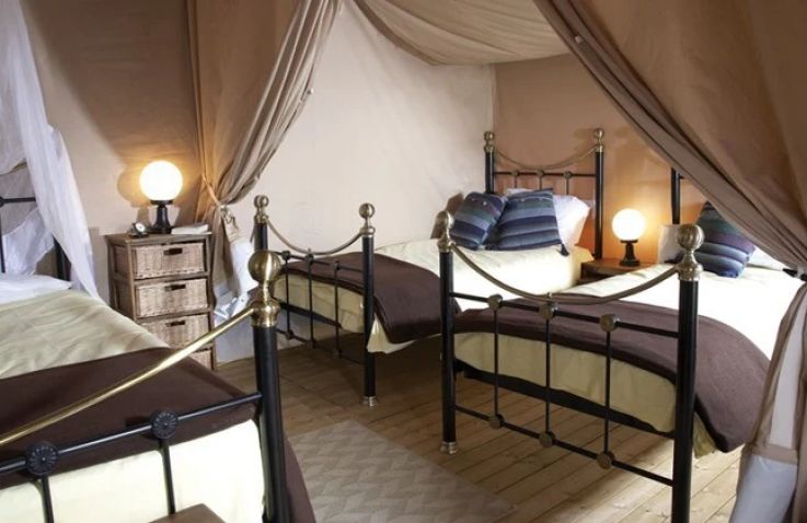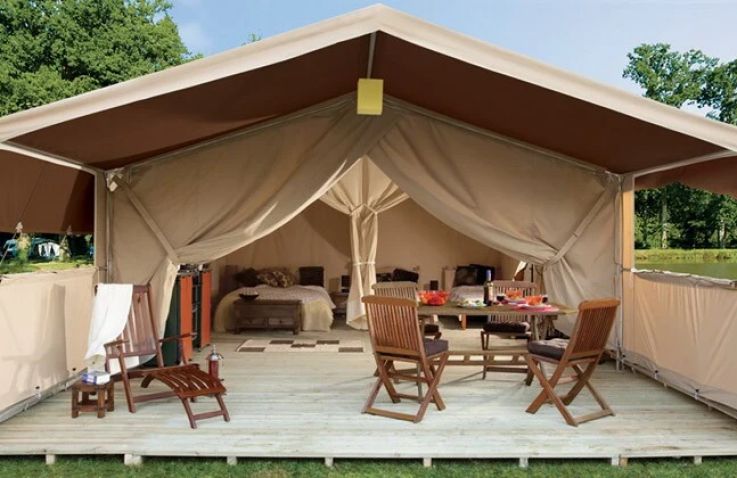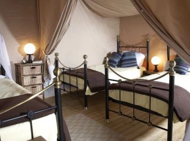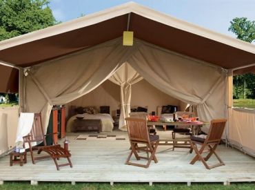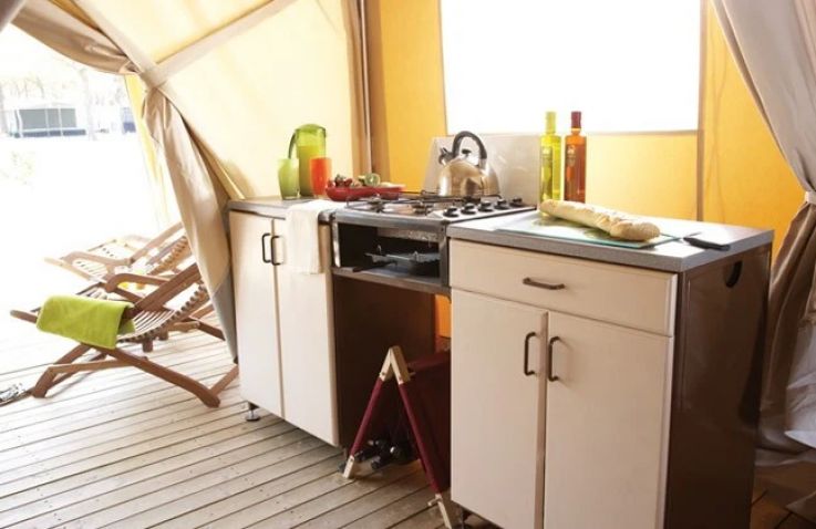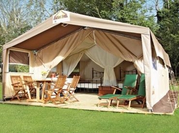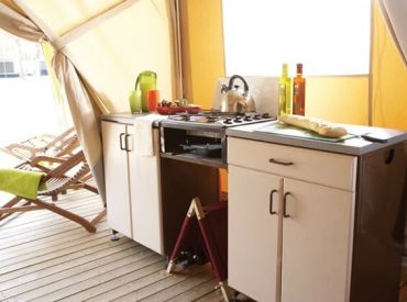Das geräumige Safarizelt ohne eigenes Bad bietet Platz für 6 Personen auf 28 m² mit 3 Räumen und 2 Schlafzimmern. Das erste Schlafzimmer verfügt über ein Doppelbett, das zweite über Einzelbetten oder wandmontierte Betten – ideal für größere Familien. Der kombinierte Wohn- und Essbereich bietet gemütlichen Raum für gemeinsame Mahlzeiten. Die Küche ist Teil des Wohnraums und mit 4-Flammen-Gasbrenner sowie Kühlschrank mit Gefrierfach ausgestattet – Grundausstattung ist vorhanden. Kopfkissen sowie Decken oder Bettdecken gehören zur Ausstattung. Die ebenerdige oder kleine integrierte Holzterrasse mit Gartenmöbeln bietet entspannten Außenbereich. Die Sanitäranlagen des Campingplatzes befinden sich in der Nähe.