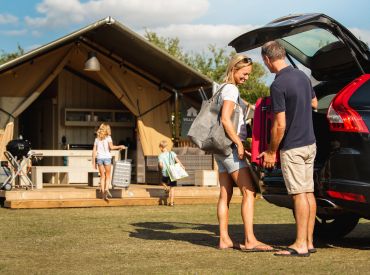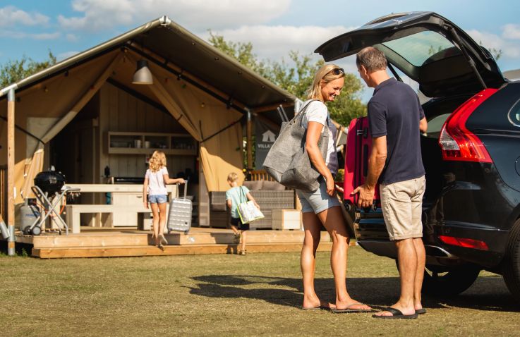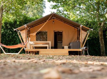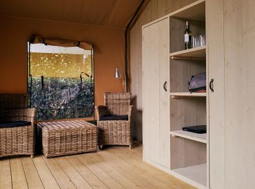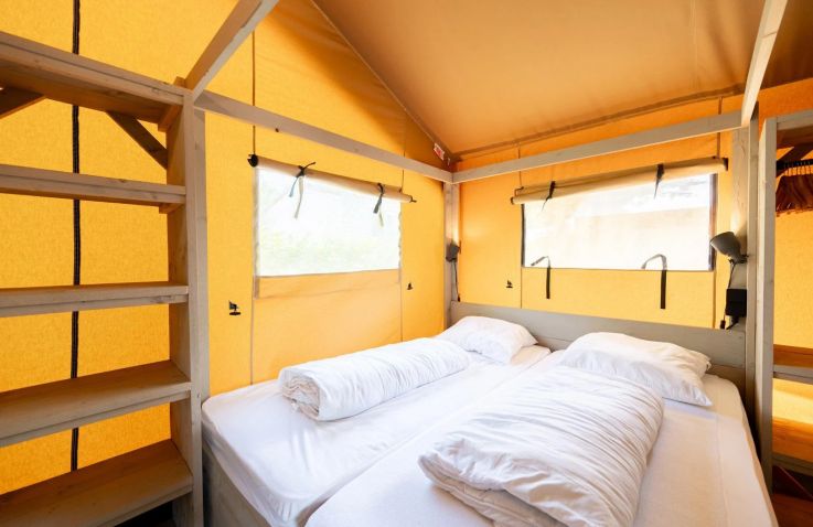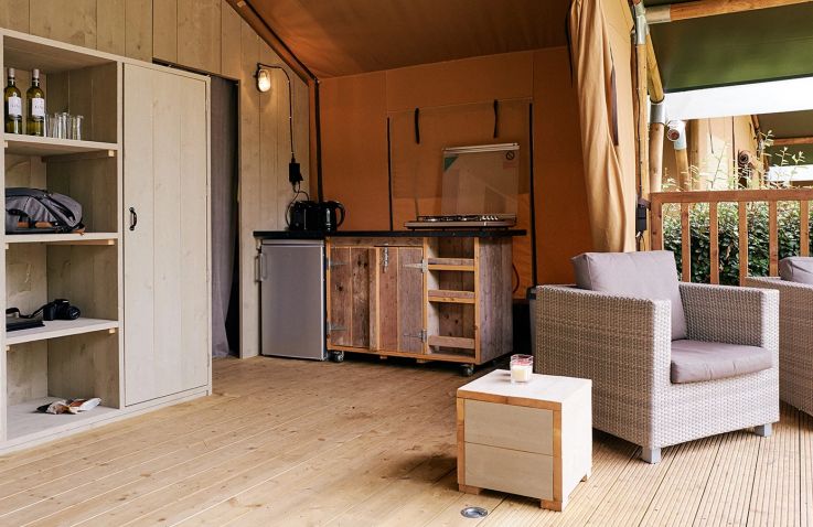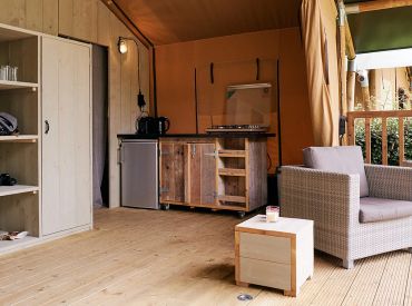 Das gemütliche Villatent Wood Safarizelt bietet Platz für 5 Personen auf 35 m² (inkl. Terrasse) mit 3 Räumen und 2 Schlafzimmern. Das erste Schlafzimmer verfügt über ein Doppelbett, das zweite über ein Etagenbett. Zusätzlich steht ein Klappbett für 1 Person zur Verfügung – ideal für Familien. Der kombinierte Wohn- und Essbereich mit Esstisch und 2 Stühlen bietet gemütlichen Raum für gemeinsame Mahlzeiten. Die Küche ist Teil des Wohnraums und mit 4-Flammen-Gasbrenner, Kühlschrank mit kleinem Gefrierfach, Nespresso-Kaffeemaschine und Wasserkocher ausgestattet. Kopfkissen und Bettdecke gehören zur Ausstattung. Die Holzterrasse mit Markise bietet luxuriösen Outdoor-Bereich: hölzerne Gartenmöbel, Hängematte, Grill (Gas, wenn vor Ort erlaubt), Lounge-Stühle, 2 Kissen, Wäscheständer und Gartentisch. Die Sanitäranlagen des Campingplatzes befinden sich in der Nähe.