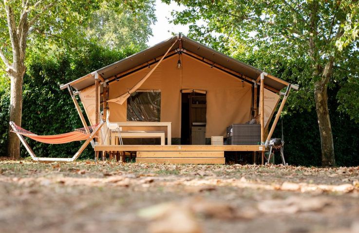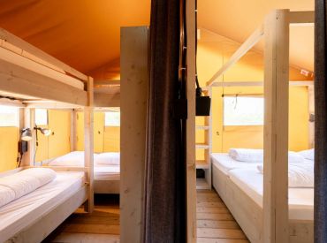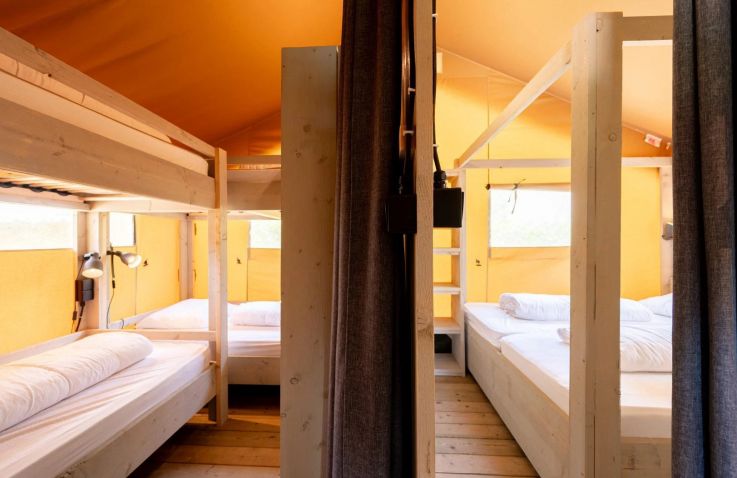 Das großzügige Villatent Nomad Safarizelt bietet Platz für 6 Personen auf 45 m² (inkl. Terrasse) mit 3 Räumen und 2 Schlafzimmern. Das erste Schlafzimmer verfügt über ein Doppelbett, das zweite über 2 Etagenbetten – perfekt für größere Familien. Ein Badezimmer mit WC, Waschbecken und Dusche bietet komfortablen Sanitärbereich direkt in der Unterkunft. Der kombinierte Wohn- und Essbereich mit 2 Stühlen lädt zum Entspannen ein. Die Küche ist Teil des Wohnraums und mit 4-Flammen-Gasbrenner, großem Kühlschrank mit Gefrierfach, Nespresso-Kaffeemaschine und Wasserkocher ausgestattet. Kopfkissen und Bettdecke gehören zur Ausstattung. Die Holzterrasse mit Markise bietet entspannten Outdoor-Bereich: Gartenmöbel, Wäscheständer, Grill (Gas, wenn vor Ort erlaubt), 2 Gartenstühle, Hängematte und Gartentisch.
