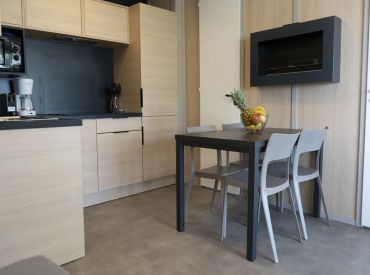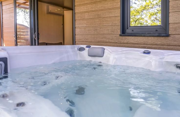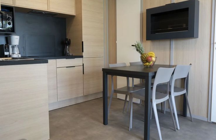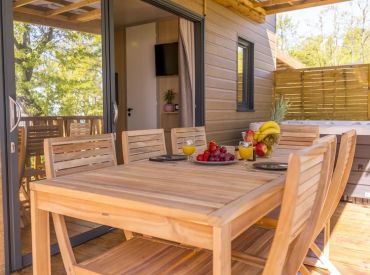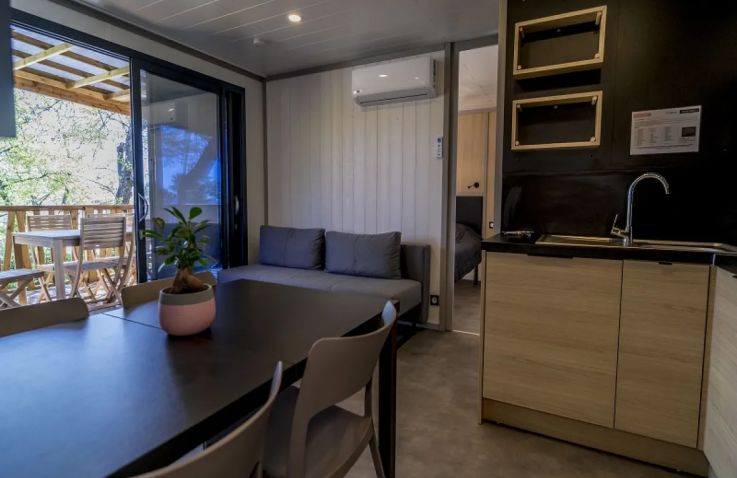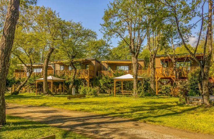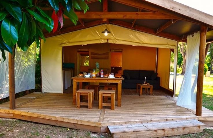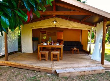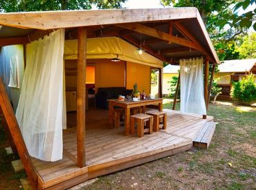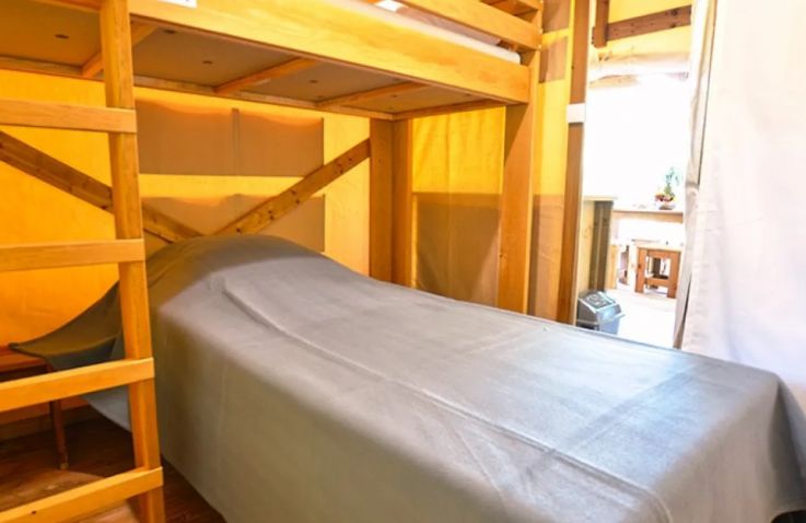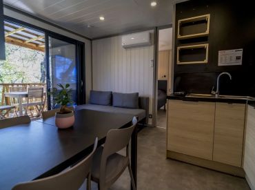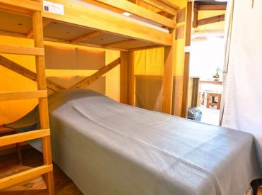 Die Tent Lodge Riada ist eine ökologische Holzhütte für bis zu fünf Personen in grüner, naturnaher Umgebung. Im Inneren befinden sich ein Wohnraum mit Sitz- und Essbereich sowie eine praktische Küche mit zwei Kochplatten, Spüle, Kühlschrank mit Gefrierfach, Mikrowelle, Geschirr für fünf Personen und einer Senseo-Kaffeemaschine. Die zwei Schlafzimmer bieten ein Doppelbett sowie ein Zimmer mit einem Einzelbett und einem Hochbett; im Wohnzimmer befindet sich zusätzlich ein Schlafsofa. Wichtig: Die Unterkunft verfügt über keine eigenen Sanitäranlagen – Dusche und Toilette stehen als Gemeinschaftssanitäranlagen in fußläufiger Entfernung zur Verfügung. Eine großzügige überdachte Terrasse mit Loungesofas und Esstisch lädt zum Entspannen im Freien ein. Decken und Kissen sind inklusive; Bettwäsche und Handtücher sind gegen Aufpreis zubuchbar.