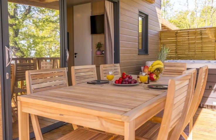 Die Lodge Prestige Pilotis Zeezicht ist eine großzügige Holzunterkunft in erhöhter Lage für bis zu neun Personen, die dank ihrer Pilotis-Konstruktion einen Meerblick zwischen den Bäumen bietet. Im Inneren befinden sich drei Schlafzimmer: ein Zimmer mit Doppelbett, ein Zimmer mit zwei Einzelbetten sowie ein drittes Zimmer mit drei Schlafplätzen, darunter ein Ausziehbett. Zusätzlich steht im Wohnzimmer ein Schlafsofa zur Verfügung. Die vollständig ausgestattete Küche verfügt über einen Gasherd, Kühlschrank, Mikrowelle, Geschirrspüler und eine Nespresso-Maschine. Das Badezimmer ist mit Dusche, separater Toilette, Waschbecken und Föhn ausgestattet. Die überdachte Terrasse von 26 m² mit Gartenmöbeln sowie ein privater Jacuzzi runden das Angebot ab. Klimaanlage und kostenloses WLAN sind inklusive. Bettwäsche ist inbegriffen; Handtücher können gegen Aufpreis hinzugebucht werden. Hunde sind willkommen.