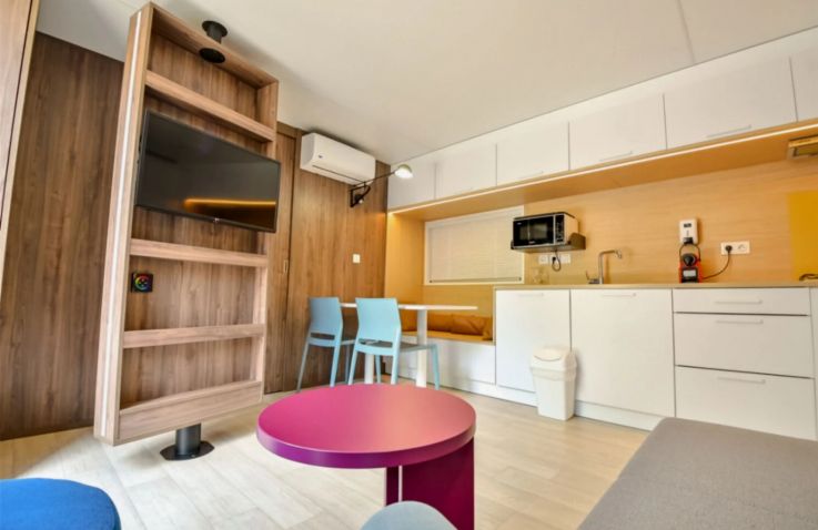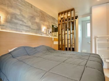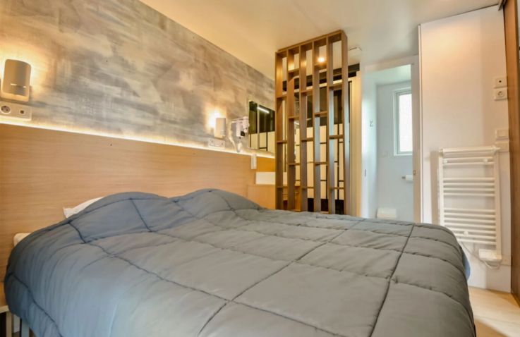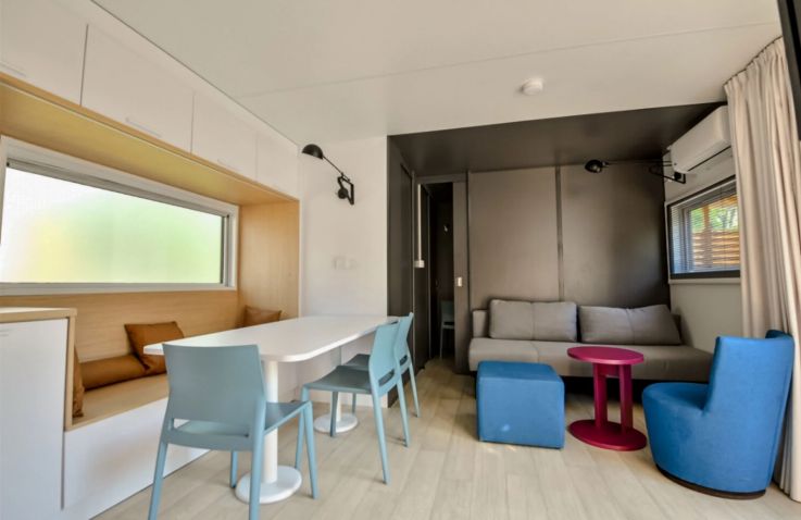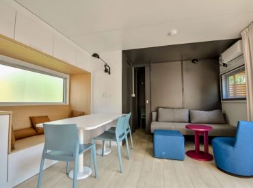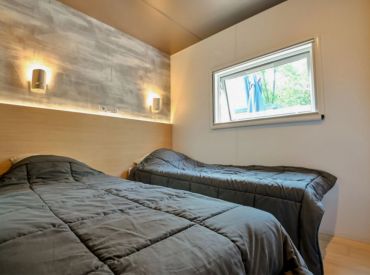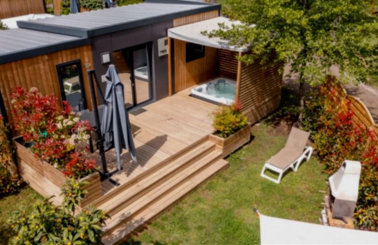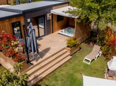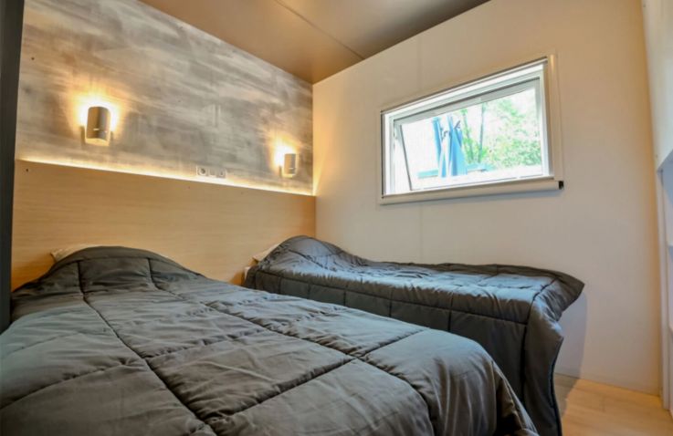 Das komfortable Lodge Natura Mobilheim bietet Platz für 4 Personen auf 40 m² mit 3 Räumen und 2 Schlafzimmern. Das erste Schlafzimmer verfügt über ein Doppelbett (160 x 200 cm), das zweite über 2 Einzelbetten. Besonders komfortabel: 2 separate Badezimmer jeweils mit Waschbecken und Dusche sowie 2 separate Toiletten – perfekt für Familien oder Freundesgruppen. Ein Haarföhn ist vorhanden. Der kombinierte Wohn- und Essbereich mit Sofa, Esstisch, Stühlen und Fernseher (Kanäle nicht in allen Sprachen vorhanden) lädt zum Entspannen ein. Die Küche ist Teil des Wohnraums und mit Induktionsherd, Kühlschrank mit kleinem Gefrierfach, Nespresso-Kaffeemaschine, Mikrowelle und Geschirrspüler ausgestattet – Grundausstattung ist vorhanden. Klimaanlage sorgt für angenehme Temperaturen. Die teilüberdachte Holzterrasse mit Gartenmöbeln, Grill, Hängematte und Jacuzzi bietet luxuriösen Outdoor-Bereich. Kopfkissen sowie Decken oder Bettdecken gehören zur Ausstattung.