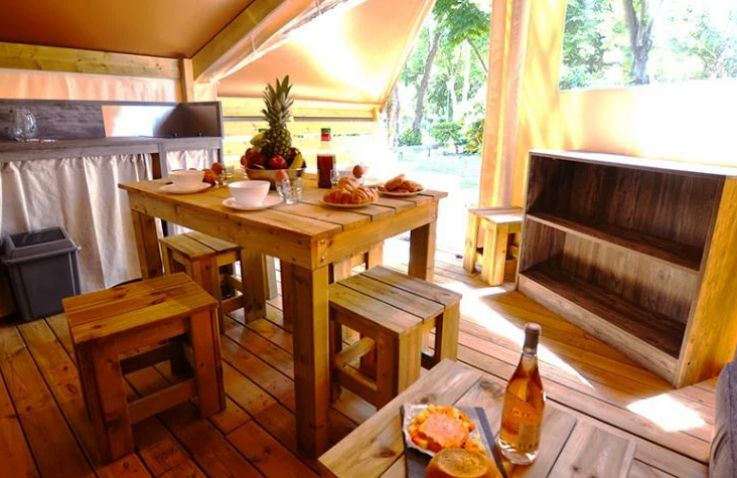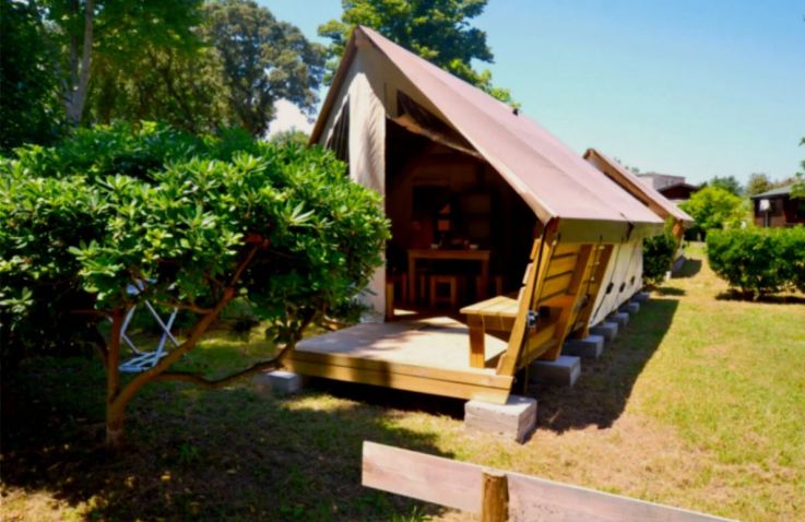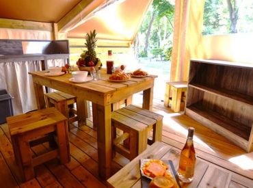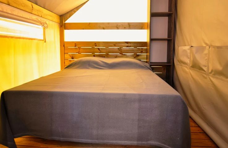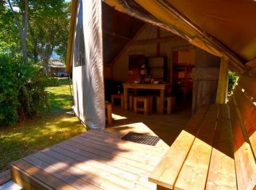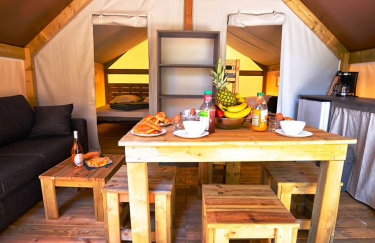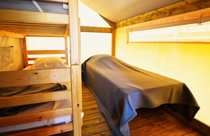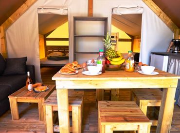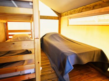 Das geräumige Tente Liberta Lodgezelt bietet Platz für 5 Personen auf 27 m² mit 3 Räumen und 2 Schlafzimmern. Das erste Schlafzimmer verfügt über ein Doppelbett, das zweite über ein Einzelbett und ein Etagenbett – ideal für Familien mit Kindern. Der kombinierte Wohn- und Essbereich mit Sofa, Esstisch und Stühlen bietet gemütlichen Raum für gemeinsame Mahlzeiten. Die Küche ist Teil des Wohnraums und mit 2-Flammen-Herd, Kühlschrank, Senseo-Kaffeemaschine und Mikrowelle ausgestattet – Grundausstattung ist vorhanden. Kopfkissen sowie Decken oder Bettdecken gehören zur Ausstattung. Die voll überdachte Holzterrasse mit Gartenmöbeln bietet geschützten Außenbereich. Die Sanitäranlagen des Campingplatzes befinden sich in der Nähe.