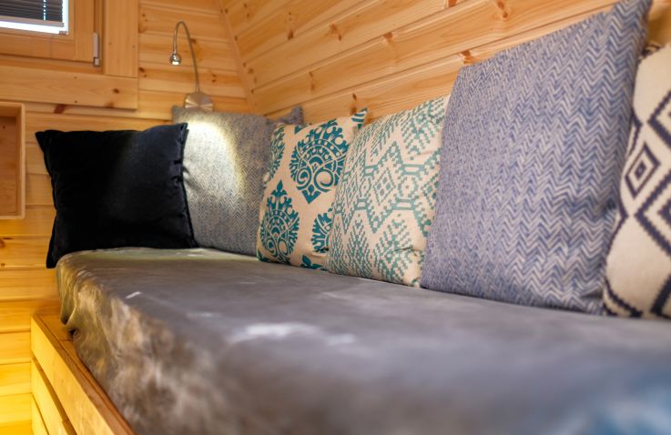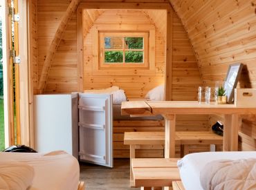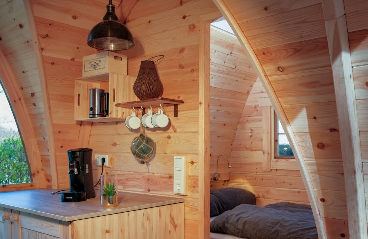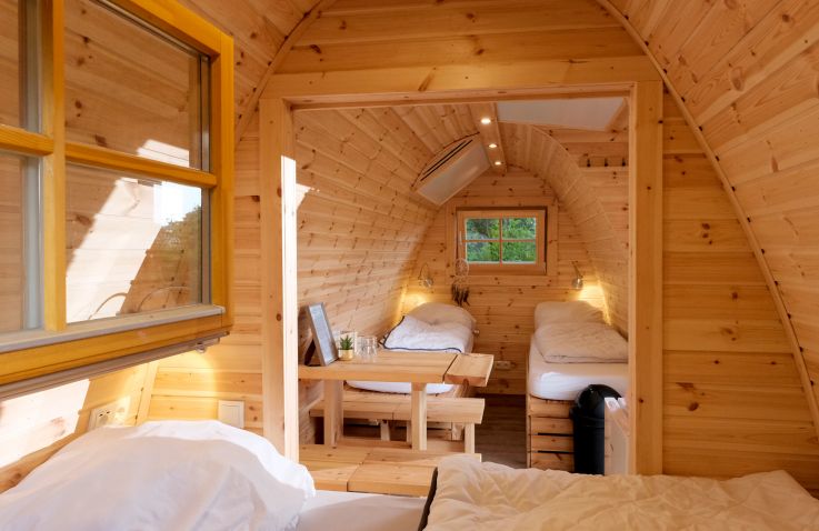 Ankommen und genießen! Ohne Aufbau & Co.! Im gemütlichen Pod erwarten dich bequeme Schlafkojen, eine Sitzecke, ein Kühlschrank, eine Heizung, große Staufächer und mehr. Kuschel-Bettwäsche kannst du direkt bei uns mieten.