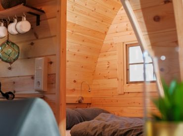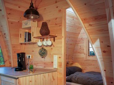 Hier duftet alles nach Holz, Harz und Romantik! Geschützt von dicken Blockbohlen, eingemummelt in die gemütliche Bettdecke und mit der Tasse Kaffee in der Hand blickst du direkt aus dem Bett durchs Panorama-Fenster über den See. Pods gehören auf die „Bucket-List“ jedes echten Campers – und auch bei uns hast du jetzt den Luxus, in den nagelneuen, halbrunden, geräumigen Holzhütten unterzuschlüpfen. Die Pods sind geeignet für 2 Erwachsene und 2 Kinder.