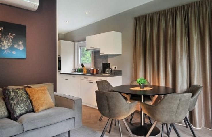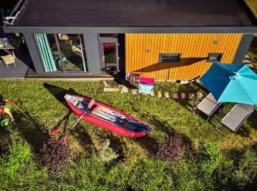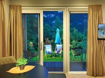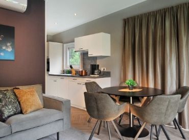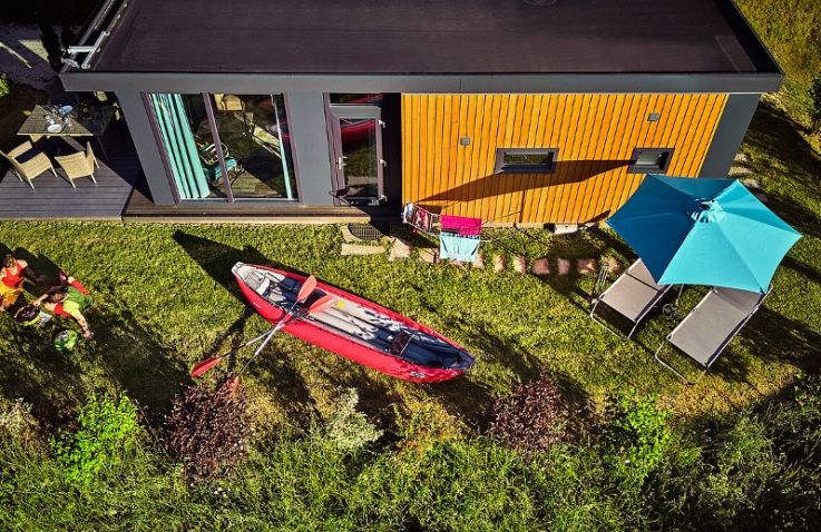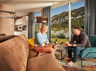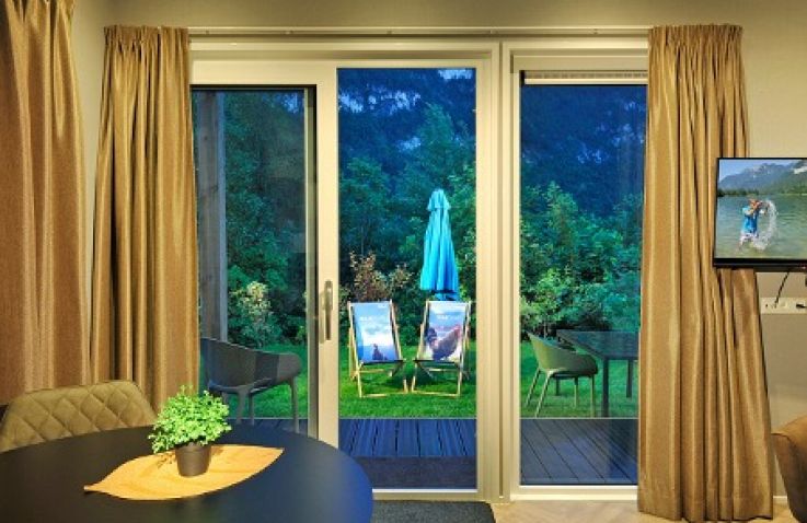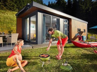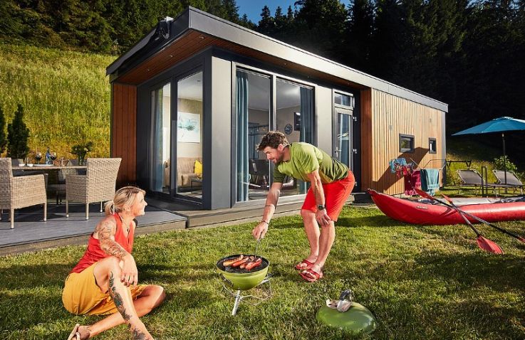 Die umfangreiche Ausstattung lässt keine Wünsche offen: moderne Couch, großer Tisch mit Stühlen, Flat-TV, WLAN, Effektfeuer sowie eine voll ausgestattete Küche mit 4-Flammen-Gasherd, Kühlschrank mit Tiefkühlfach, Geschirrspülmaschine, Kombimikrowelle, Kaffeemaschine und Wasserkocher. Auch draußen lädt der Loungebereich mit Loungecouch und -tisch zum Entspannen ein. Bitte beachte, dass die Panorama Chalets in der Hochsaison nur wochenweise buchbar sind und Handtücher selbst mitzubringen sind.