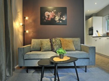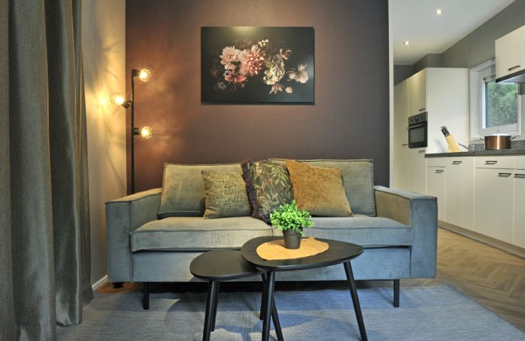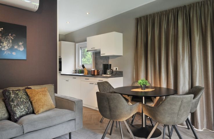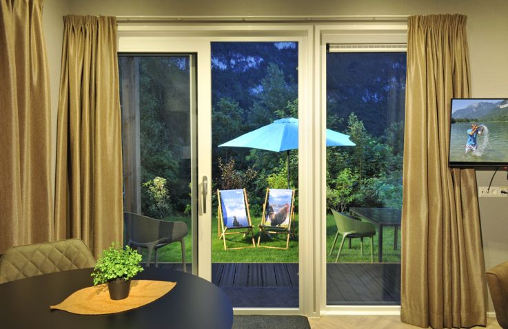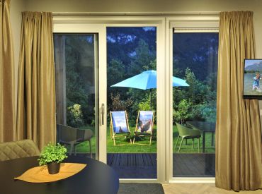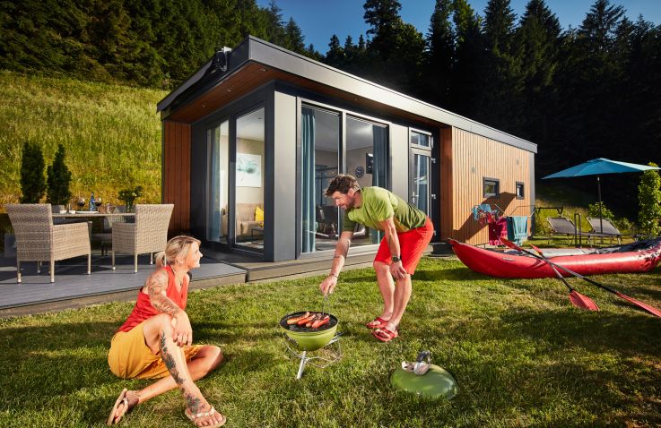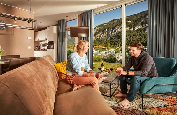 Die umfangreiche Ausstattung lässt keine Wünsche offen: moderne Couch, großer Tisch mit Stühlen, Flat-TV, WLAN, Effektfeuer sowie eine voll ausgestattete Küche mit 4-Flammen-Gasherd, Kühlschrank mit Tiefkühlfach, Geschirrspülmaschine, Kombimikrowelle, Kaffeemaschine und Wasserkocher. Auch draußen lädt der Loungebereich mit Loungecouch und -tisch zum Entspannen ein. Bitte beachte, dass die Panorama Chalets in der Hochsaison nur wochenweise buchbar sind und Strandtücher selbst mitzubringen sind.