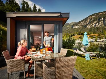 Entdecke eine der 45 m² großen Mountain Lodges vom Campingresort Seeblick Toni, als deinen neuen Rückzugsort für entspannte Tage in den Tiroler Bergen. Dich erwartet ein gemütliches Schlafzimmer mit Doppelbett sowie ein separates Kinderzimmer, das je nach Bedarf mit zwei Einzelbetten oder einem Etagenbett ausgestattet ist. Der moderne Wohn- und Küchenbereich lädt zu gemeinsamen Momenten ein, während das Badezimmer mit Erlebnisdusche und WC für extra Komfort sorgen. Besonders schön ist der großzügige Garten mit traumhaftem Blick auf die majestätische Bergwelt.