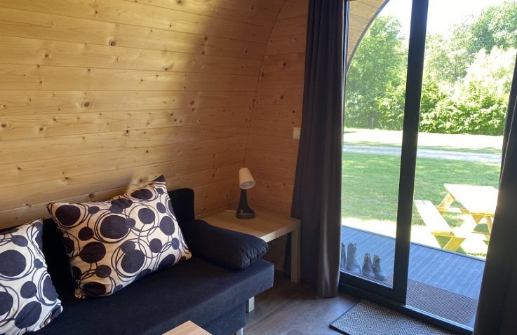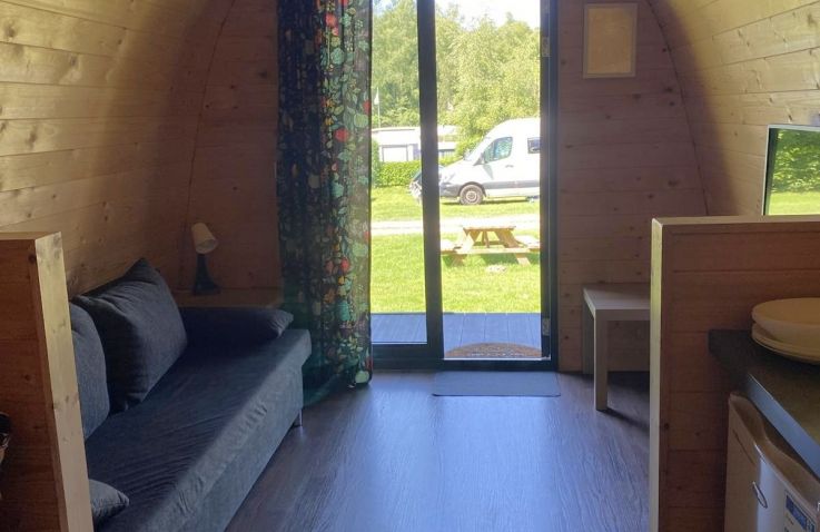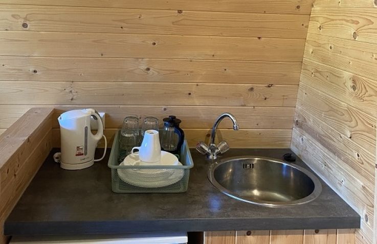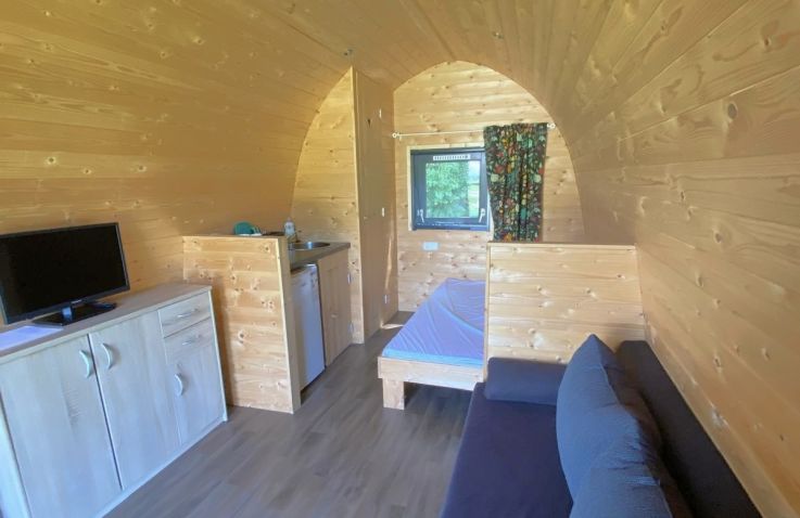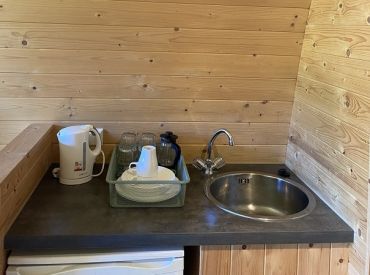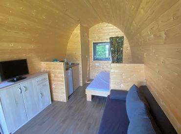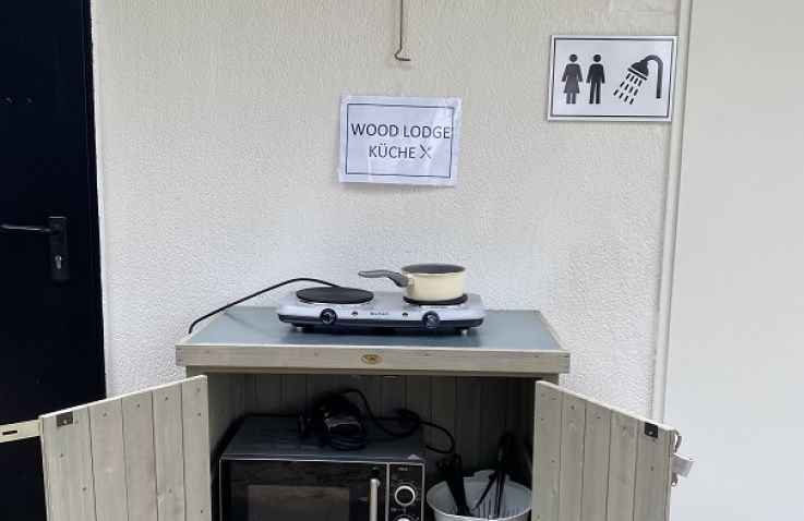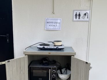 Die Wood Lodges sind kleine Campinghütten, in denen du auf wenigen Quadratmetern deinen Urlaub in der Natur genießen kannst. Das Innenleben verfügt über eine Elektroheizung sowie ein 1,40m breites Doppelbett, ein Ausziehsofa mit kleinem Tisch und ein Sideboard. Ein kleiner Fernseher, Wasserkocher und Geschirr/Besteck stehen ebenfalls zur Verfügung. Vor der Hütte befindet sich eine Picknickbank. Spülbecken, Duschen und Toiletten befinden sich in Haus 3 nur wenige Schritte entfernt. Der Wood Lodge Küchenschrank befindet sich außerhalb an Haus 3 und beinhaltet eine Mikrowelle, 2 Kochplatten mit Pfannen und Töpfen.