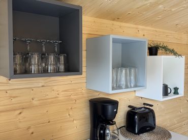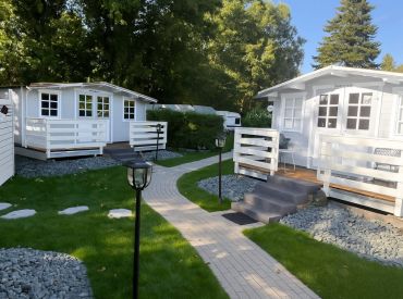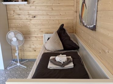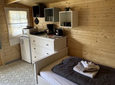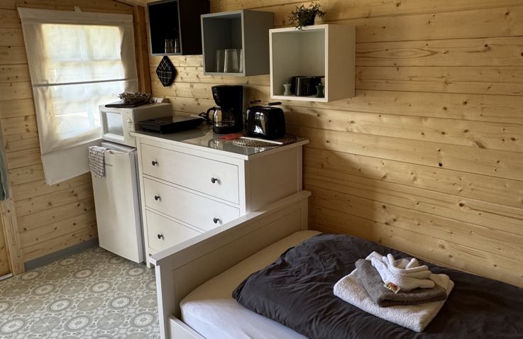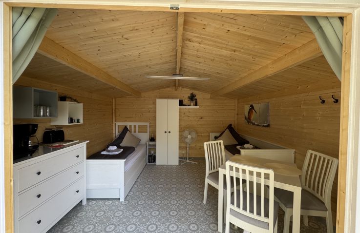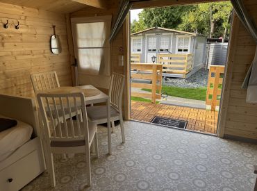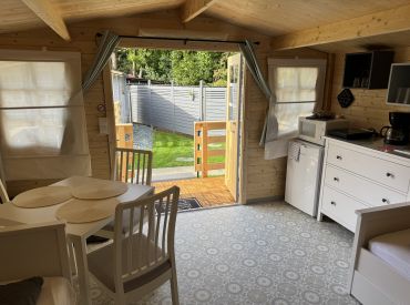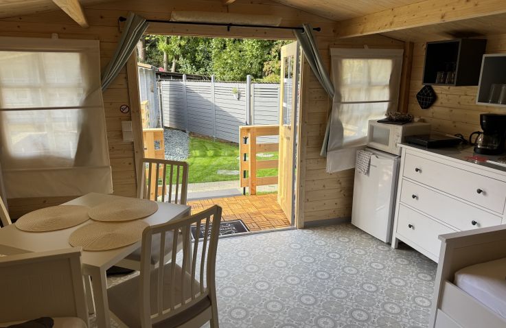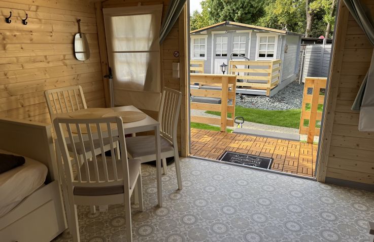Die großzügigen Blockhütten auf dem Campingplatz Wetzlar bieten auf rund 25 m² viel Platz für bis zu fünf Personen. Drinnen warten ein komfortables Doppelbett und ein praktisches Stockbett. Die Ausstattung lässt kaum Wünsche offen: WLAN und Strom sind inklusive, Bettwäsche und Handtücher liegen bereit, und um die Müllentsorgung ist ebenfalls gesorgt. In den Hütten findest du alles, was du für einen entspannten Aufenthalt brauchst: Kommode, Kleiderschrank, Esstisch mit fünf Stühlen, Kühlschrank sowie eine kleine Kochgelegenheit mit Herdplatte, Kaffeemaschine, Toaster, Tellern, Besteck, Töpfen und Pfannen. Die Sanitäranlagen mit WC und Dusche befinden sich im Hauptgebäude – Frischwasser bekommst du an der Entnahmestelle oder im Spülbereich. Und das Beste: Dein Vierbeiner ist herzlich willkommen!