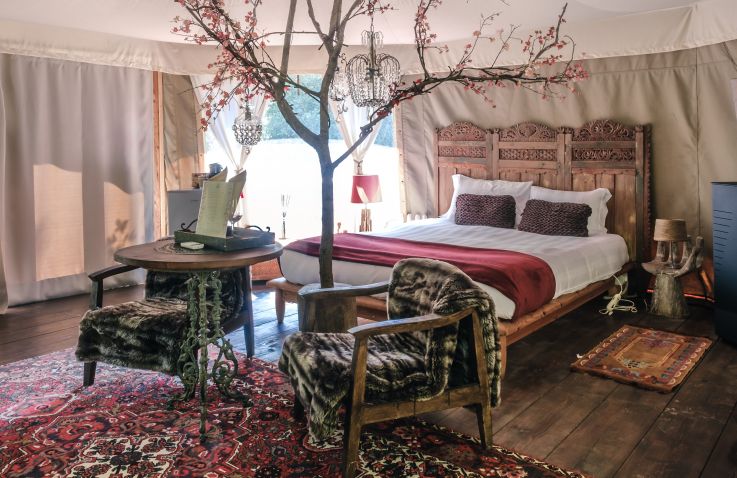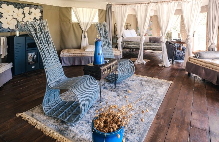 Jedes Zelt verfügt über einen großzügigen Schlafbereich mit Kingsize-Bett und hochwertiger Bettwäsche, ein privates Badezimmer mit Dusche sowie einen gemütlichen Wohnbereich mit einzigartigen Möbeln und handgefertigten Details. Ein eigener Garten lädt dazu ein, die Ruhe des Parks ganz für sich zu genießen. Klimaanlage und Heizung sorgen das ganze Jahr über für perfekten Komfort, während ein Minikühlschrank Getränke kühl hält und Platz für kleine Leckereien bietet. Ausgewählte Pflegeprodukte, Tee und Kräutertees sowie liebevolle Annehmlichkeiten tragen zusätzlich zu deinem Wohlbefinden bei. Dank der WLAN-Verbindung bleibst du verbunden, ohne dass die Atmosphäre der Abgeschiedenheit verloren geht.