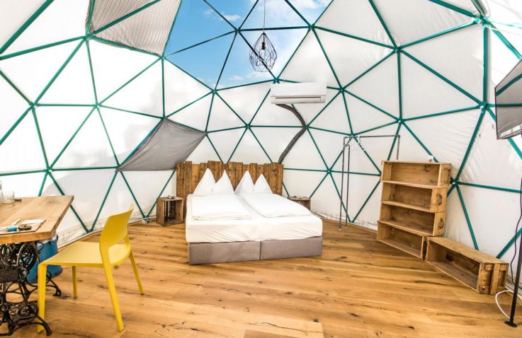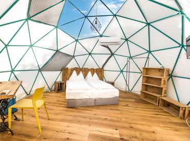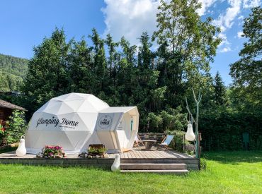Der Glamping Dome am Wolfgangsee vereint Naturnähe mit echtem Wohnkomfort: Auf 20 m² Wohnfläche mit großzügiger Terrasse schläft man buchstäblich unterm Sternenhimmel, dank dem transparenten Dach, das den Blick in die Nacht freilässt. Klimaanlage, Fernseher und schnelles WLAN sorgen dabei für angenehmen Komfort. Ein privates Bad mit WC und Waschbecken im Haupthaus sowie die Duschen aus dem Campingbereich stehen zur Verfügung.