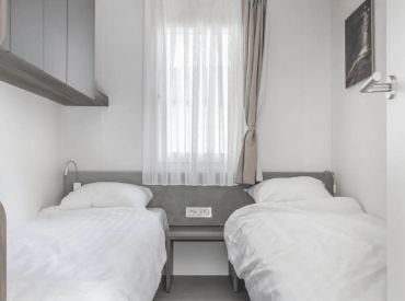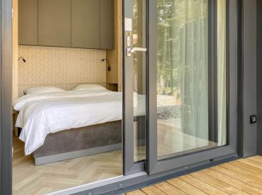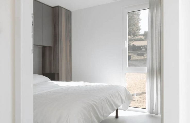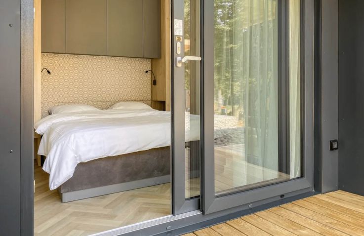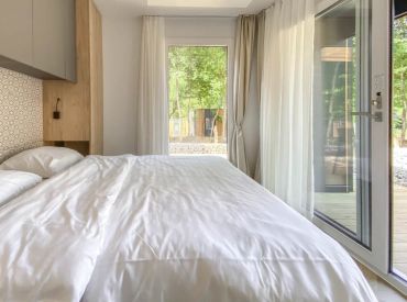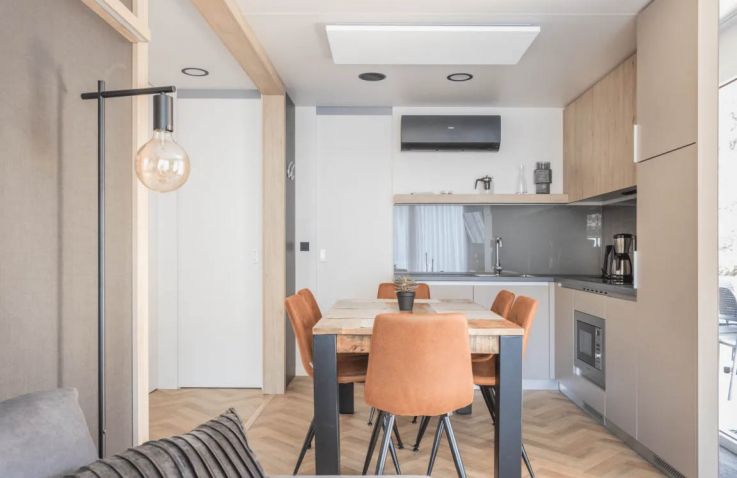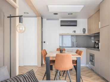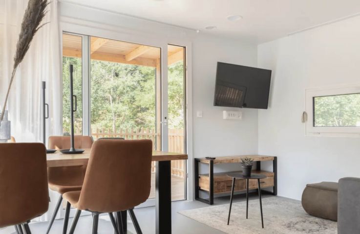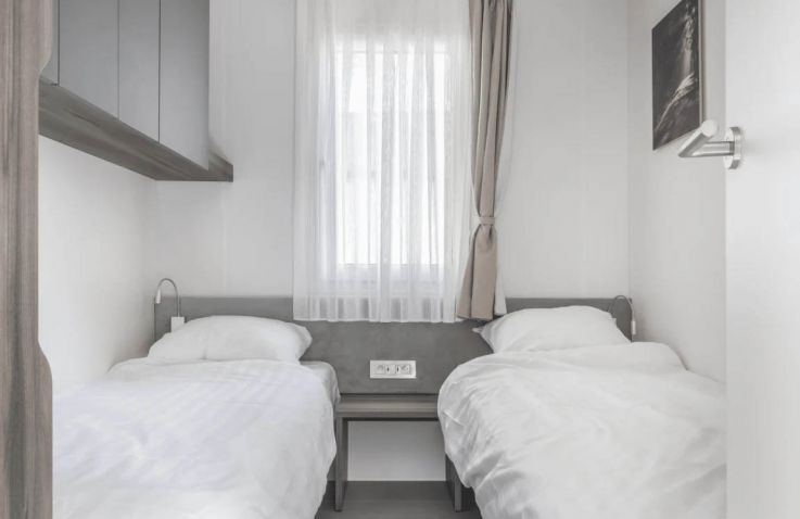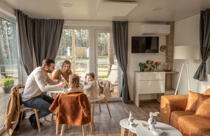 Die Hütte Domus 4 kann 4 Personen beherbergen. Es gibt zwei Schlafzimmer, eines mit einem Doppelbett und eines mit 2 Einzelbetten. Im geräumigen Wohnzimmer findest du eine Sitzecke mit Fernseher, einen Essbereich und eine Küche mit allen Annehmlichkeiten. Denk an Kühlschrank, Geschirrspüler, Mikrowelle und Kaffeemaschine. Das Badezimmer hat eine Dusche und ein Waschbecken. Die Toilette befindet sich in einem separaten Raum. Hast du Lust, draußen zu sitzen? Das kannst du auf der möblierten Terrasse tun.