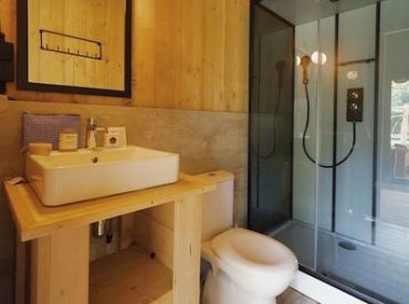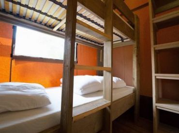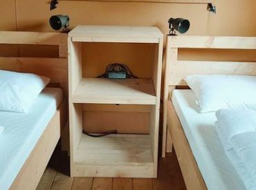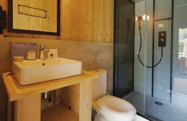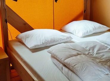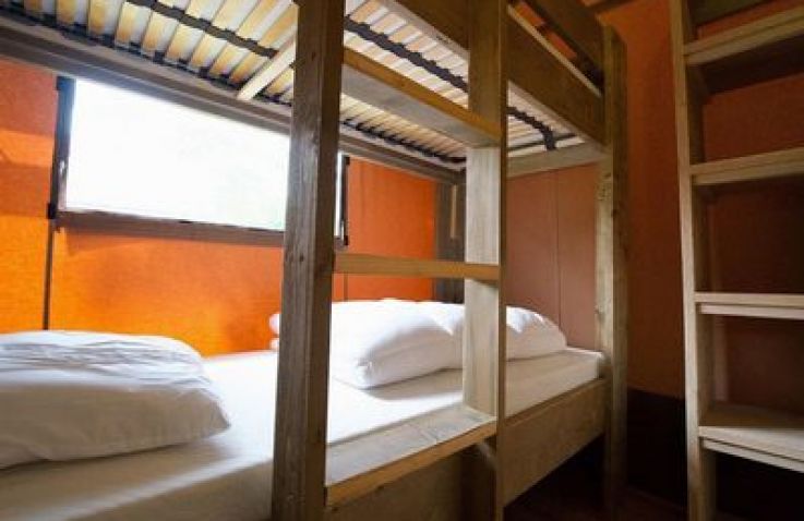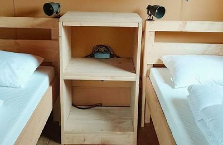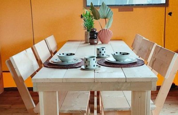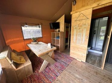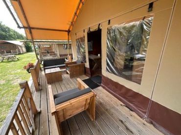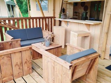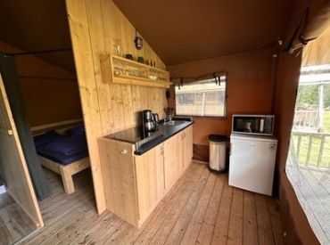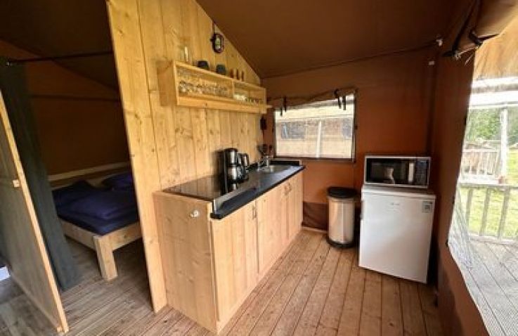 Die großen Safarizelte sind perfekt ausgerichtet für bis zu vier Personen. Besonders schön: Im Innenraum wurde fast ausschließlich mit natürlichen Materialien gearbeitet. Es verfügt über ein Doppelbett und zwei Einzelbetten bei dem kuschlige Abende garantiert sind. Neben einer offenen Wohn-Küche mit Kühl-/Gefrierkombination, Induktionsherd, Wasserkocher, Kombi-Mikrowelle und Filterkaffeemaschine, gibt es eine überdachte Veranda mit Tisch und einer Bar, perfekt für alle Picknickliebhaber. Im Badezimmer findest du alles was man braucht: Dusche, Waschbecken und Toilette. Die Safarizelte sind super für alle, die den traditionellen Campingurlaub lieben, aber nicht auf gewisse Vorzüge verzichten möchten.