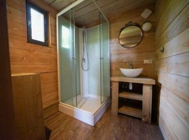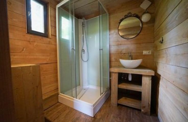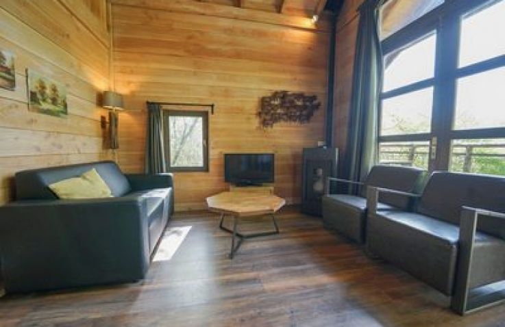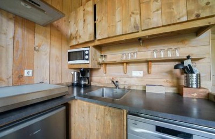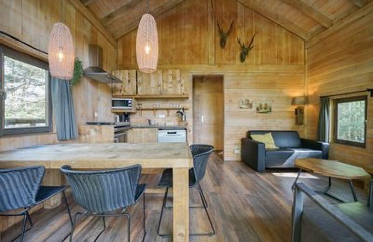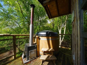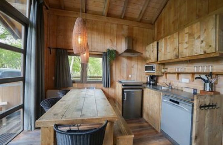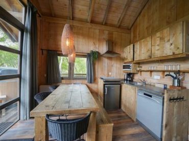 Das XXL-Baumhaus verfügt über ein großes Wohnzimmer mit TV und eine voll ausgestattete Küche mit Geschirrspüler. Das Baumhaus ist gut isoliert und wird mit einem Holz-/Pelletofen beheizt. Auf der halb überdachten Terrasse nach Süden, kannst du dich nach einem langen Spaziergang im holzbefeuerten Whirlpool aufwärmen können. Das Baumhaus hat drei Schlafzimmer, eines mit einem Doppelbett und zwei mit Einzelbetten. Das Badezimmer hat eine begehbare Dusche. Platz ist für insgesamt 6 Personen.