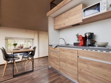 Die Safarizelte befinden sich in einem ruhigen Teil des EuroParcs. Es gibt Zelte für bis zu 4 Personen und Zelte für 6 Personen. Die luxuriösen Glamping-Zelte verfügen über private Sanitäranlagen mit Toilette, Dusche und Waschbecken, eine Küche und bequeme Betten. Die Küche ist kompakt und hat ein Kücheninventar, eine Kaffeemaschine und einen Kühlschrank. Das Safarizelt in Gelderland ist gemütlich und verfügt neben einem gemütlichen Wohnzimmer auch über eine schöne überdachte Terrasse. Mit einem Esstisch und Stühlen, so dass du bei schönem Wetter draußen sitzen kannst! Es gibt zwei getrennte Schlafzimmer, eines im Erdgeschoss und eines im Obergeschoss auf der Empore.