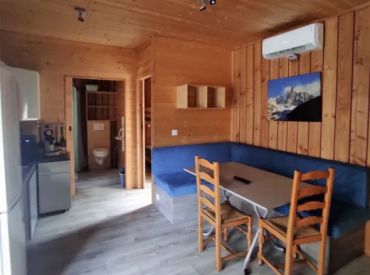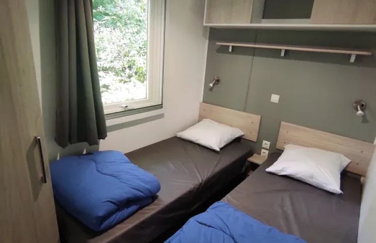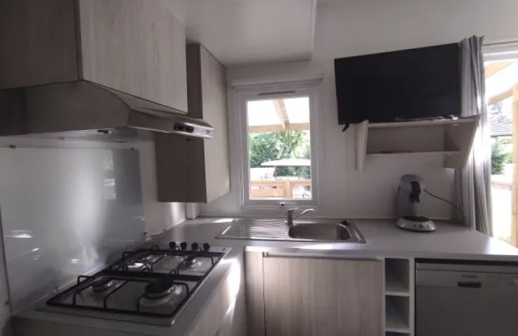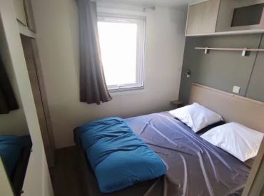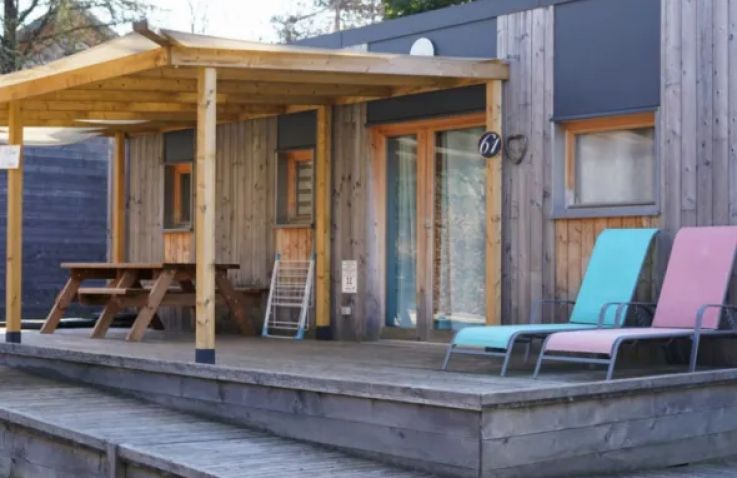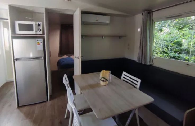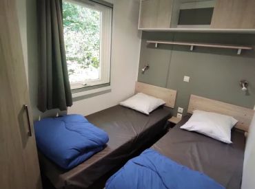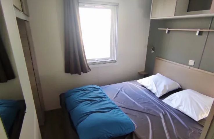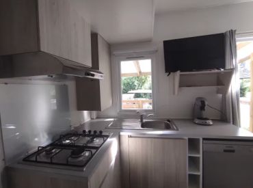 Das geräumige Mobilheim bietet auf 30 m² Platz für bis zu 8 Personen (6 Erwachsene und 2 Kinder) und überzeugt mit einer praktischen Aufteilung. Der helle Wohnbereich verfügt über Fernseher, Sitzecke und ein Schlafsofa als zusätzliche Schlafgelegenheit. Die vollständig ausgestattete Küche umfasst Kochplatten, Mikrowelle, Senseo-Kaffeemaschine, Kühlschrank mit Gefrierfach und Geschirrspüler. Drei Schlafzimmer mit 4 Einzelbetten und 1 Doppelbett bieten ausreichend Platz für die ganze Familie. Das Badezimmer verfügt über eine Dusche; die Toilette befindet sich separat. Die umkehrbare Klimaanlage sorgt im Sommer für Kühle und im Winter für Wärme. Bettdecken und Kissen sind vorhanden; Bettwäsche und Handtücher können gegen Aufpreis dazugebucht werden. Draußen wartet eine überdachte Terrasse mit Loungeset und Außentisch. Parken ist auf einem Parkplatz in der Nähe der Unterkunft möglich. Hunde sind willkommen.
