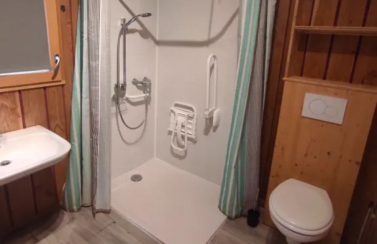 Dieses barrierearme Mobilheim auf 34 m² bietet komfortablen Urlaub für bis zu 4 Personen und ist dank einer Holzrampe auch für Gäste mit eingeschränkter Mobilität geeignet. Der Wohnbereich verfügt über Fernseher, Sitzecke, Essbereich und ein Schlafsofa. Die Küche ist ausgestattet mit Induktionskochfeld, Mikrowelle, Kühlschrank mit Gefrierfach, Kaffeemaschine und Wasserkocher. Zwei Schlafzimmer – eines mit Doppelbett, eines mit Etagenbett – stehen zur Verfügung. Das Badezimmer verfügt über Dusche, Toilette und Waschbecken. Die umkehrbare Klimaanlage sorgt für angenehme Temperaturen das ganze Jahr über. Bettdecken und Kissen sind vorhanden; Bettwäsche und Handtücher können gegen Aufpreis dazugebucht werden. Auf der halbüberdachten Terrasse mit Gartenmöbeln, Loungeset und Picknicktisch lässt es sich herrlich entspannen. Parken ist auf einem Parkplatz in der Nähe der Unterkunft möglich. Hunde sind willkommen.