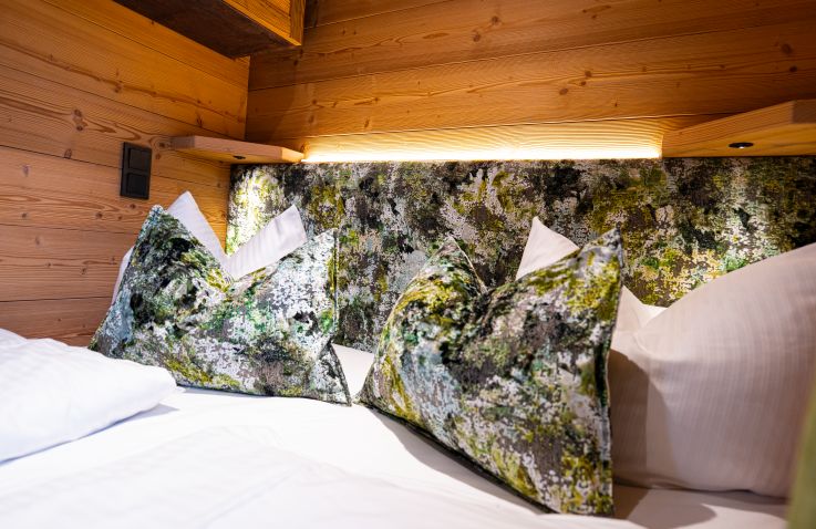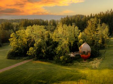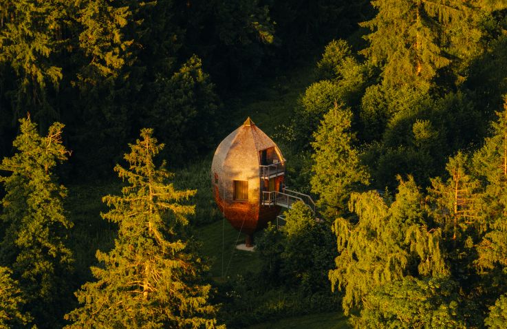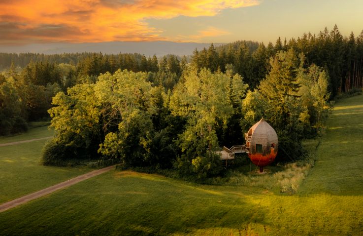 In den gemütlichen Landeiern erwartet dich ein ganz besonderes Erlebnis: Hier erfüllst du dir den Kindheitstraum vom Übernachten in den Bäumen auf luxuriöse Art und Weise. Hoch über dem Boden schwebend und mitten in der Natur verbringst du deine Urlaubstage als Paar oder mit deinen Kindern. Die Landeier haben eine Größe von etwa 38 m² und sind rundherum mit traditionellen Allgäuer Baumaterialien gebaut. Die Inneneinrichtung besteht aus heimischem Altholz. Über eine sichere Holztreppe betrittst du dein Baumhaus, das am Waldrand liegt und im Sommer fast uneinsehbar in einer großen Baumgruppe steht. Im Erdgeschoss befindet sich ein gemütliches Schlafzimmer mit geräumigem Doppelbett. Der erste Stock bietet eine Essecke, eine moderne Küchenzeile mit Kühlschrank und Geschirrspüler sowie ein Badezimmer mit Dusche und WC. Das Highlight ist die Luxuskuppel mit einem weiteren Doppelbett, Sternenblick und angeschlossener Dachterrasse. Auf der großen Veranda und Dachterrasse kannst du in luftiger Höhe die Natur genießen. Du hast eigens produzierten Solarstrom, fließend warmes Wasser und Fußbodenheizung. Eine Grillhütte sowie eine Feuerstelle stehen zur Verfügung. Der Parkplatz liegt 20-40 m entfernt, damit du von Autolärm verschont bleibst.