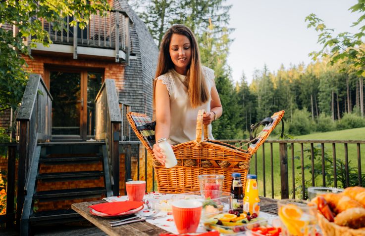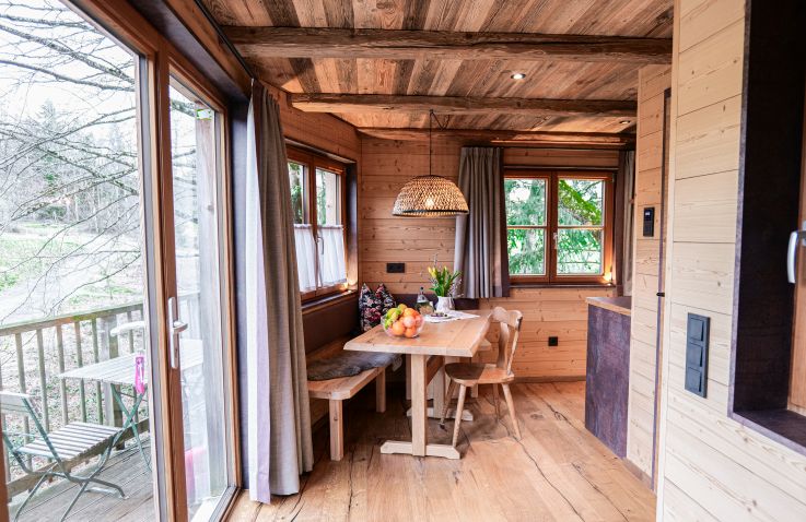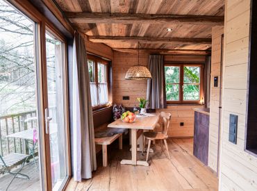 Die Premium-Baumhäuser Weitblick und Zeitraum bieten auf etwa 32 m² komfortablen Raum für bis zu 4 Personen. Die Inneneinrichtung besteht vollständig aus heimischem Holz und vermittelt mit Altholzmöbeln und heller Vertäfelung eine warme, naturverbundene Atmosphäre. Das Baumhaus verfügt über zwei getrennte Schlafzimmer mit Doppelbetten, eines im Erdgeschoss und eines im ersten Stock. Der Wohn- und Lebensbereich umfasst eine gemütliche Essecke sowie eine Küchenzeile mit Kühlschrank und Geschirrspüler. Das Bad ist mit Dusche und WC ausgestattet. Eine große Veranda und eine Dachterrasse ermöglichen entspannte Stunden in luftiger Höhe, begleitet vom Zirpen der Grillen und Vogelgezwitscher. Geparkt wird etwa 70 Meter entfernt, sodass kein Autolärm stört. Die Baumhäuser werden umweltfreundlich mit eigens erzeugtem Solarstrom versorgt. Auf Wunsch wird ein Frühstück mit regionalen Produkten im Picknickkorb direkt in die Unterkunft geliefert.