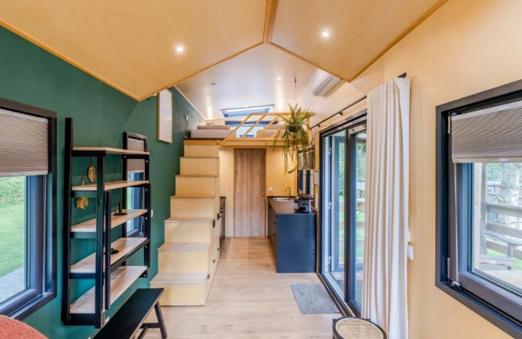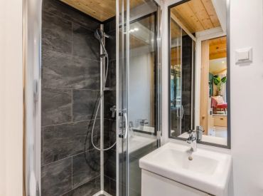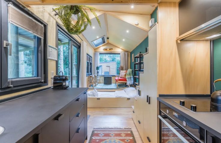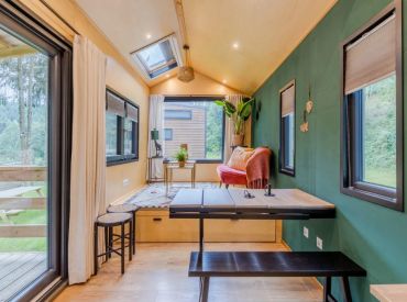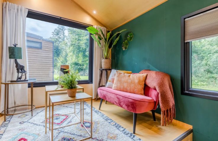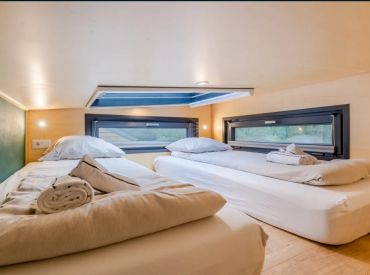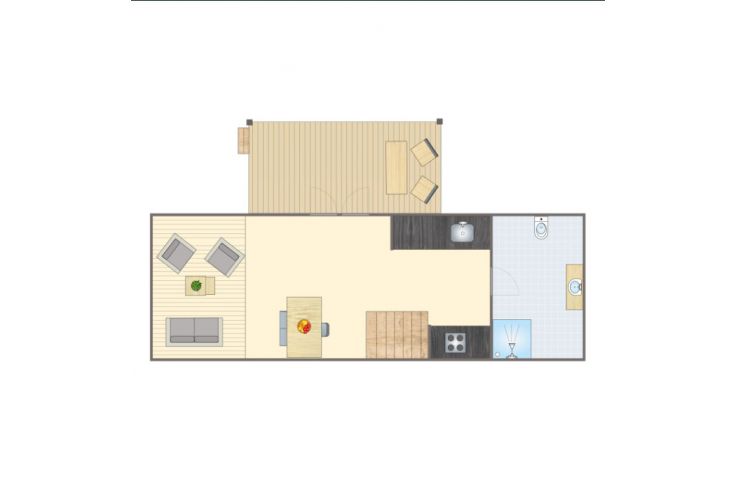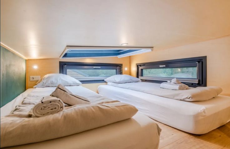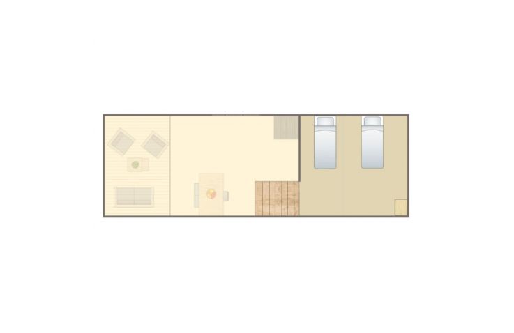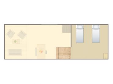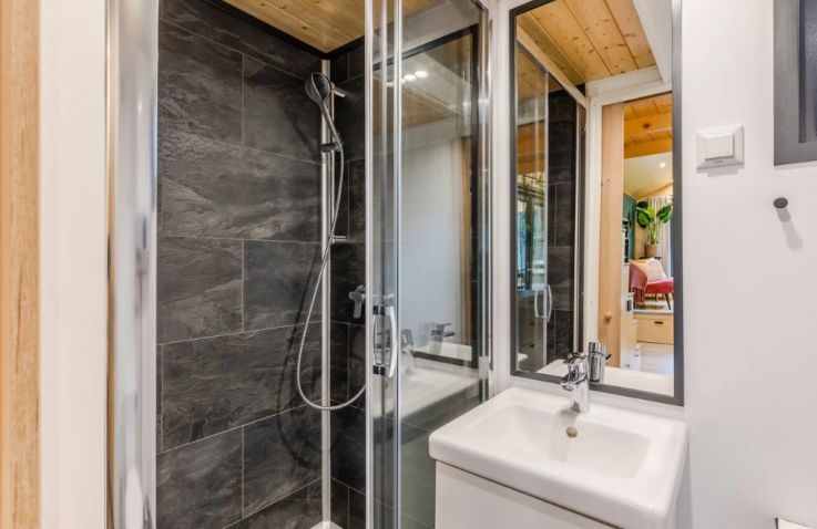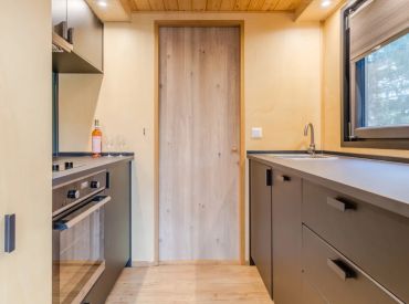 Das 2-4-Personen-Tiny House ist eine kompakte Holzunterkunft für 2 Erwachsene und 2 Kinder mit 11,5 bis 20 m² Wohnfläche. Die clevere Raumaufteilung auf zwei Etagen bietet im Hochparterre ein gemütliches Doppelbett, im Wohnzimmer steht eine Doppelschlafcouch für zusätzlichen Schlafplatz bereit. Die offene Küche ist vollständig ausgestattet mit Gasherd (4 Felder), Backofen, Kühlschrank mit Gefrierfach, Standard-Kücheninventar und Nespresso-Kaffeemaschine. Ein modernes Badezimmer mit Dusche und WC gehört zur Ausstattung. Klimaanlage und Fußbodenheizung sorgen das ganze Jahr über für angenehme Temperaturen. Die Sitzecke und Essecke schaffen trotz kompakter Größe Wohnkomfort. Auf der Terrasse lädt ein Picknicktisch mit Gartenstühlen zum Verweilen in der Natur ein. Das Auto parkst du auf dem Zentralparkplatz des autofreien Parks. Ein Haustier ist gestattet. Kinderhochstuhl auf Anfrage verfügbar.