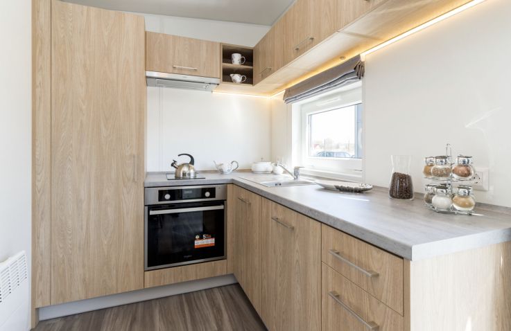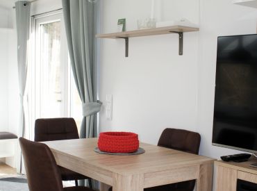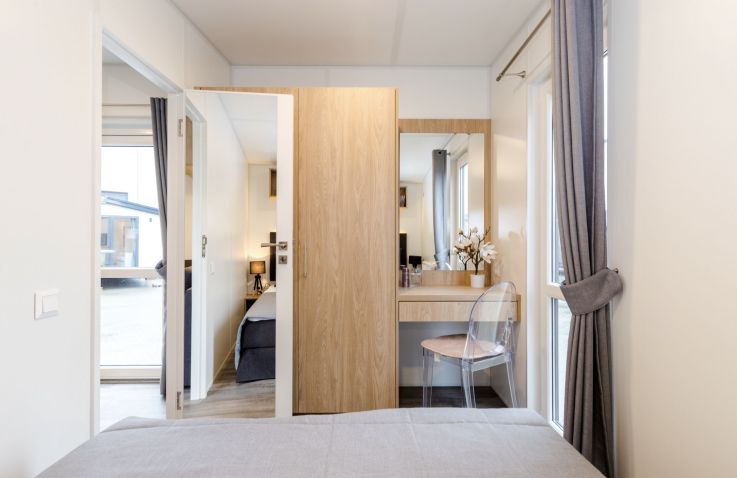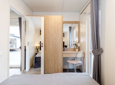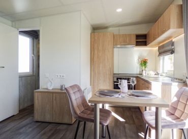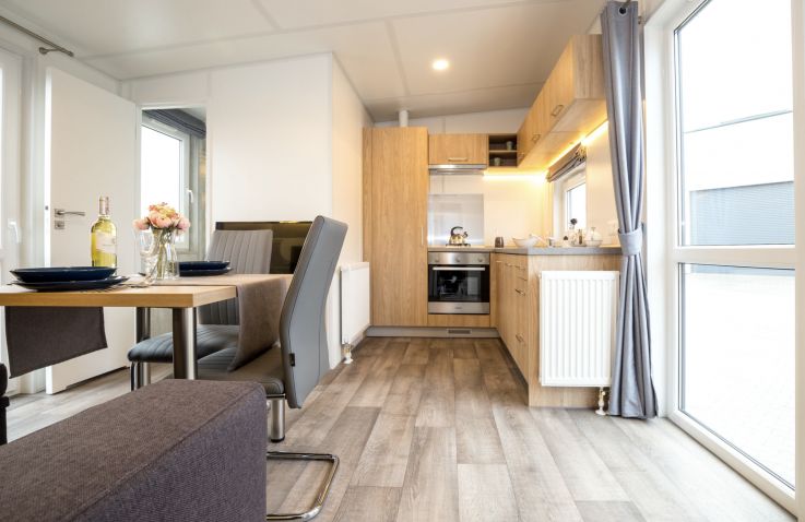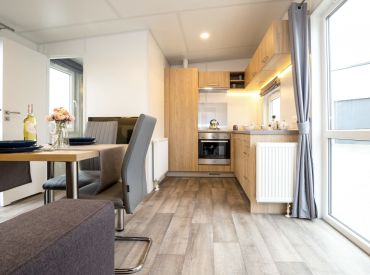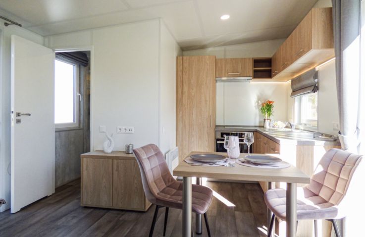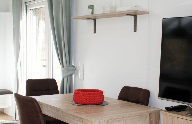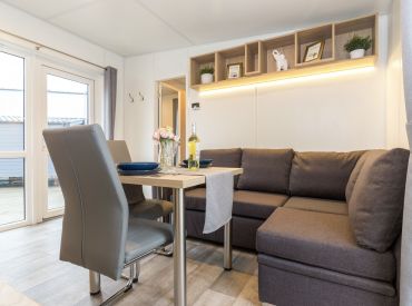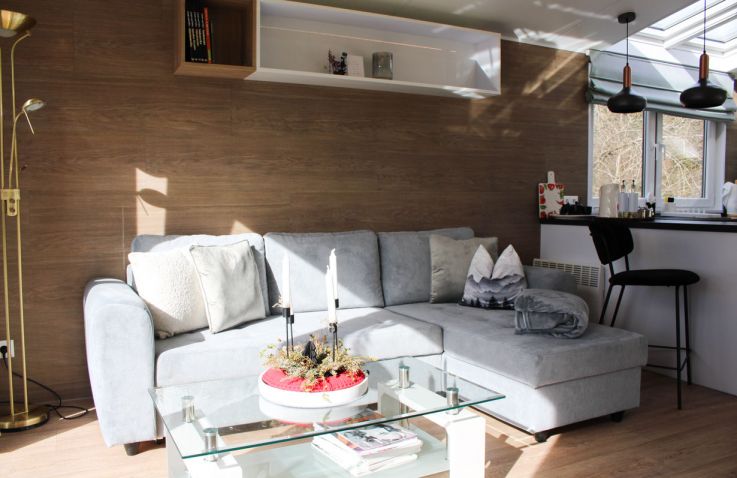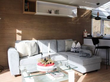 Mit schönem Blick auf die Berge bietet das etwas kleinere Tinyhaus "Franzl" insgesamt 26 m² Wohnfläche. Es ist aufgeteilt in ein Wohnzimmer mit Schlafsofa, eine gut ausgestattete Küche, ein Schlafzimmer mit hochwertigem Boxspringbett und ein Badezimmer. Darüber hinaus verfügt "Franzl", genau wie "Seppl", über WLAN mit einem eigenen Arbeitsplatz für Homeoffice sowie einen Smart TV mit Streaming-Diensten.