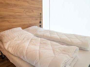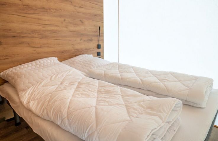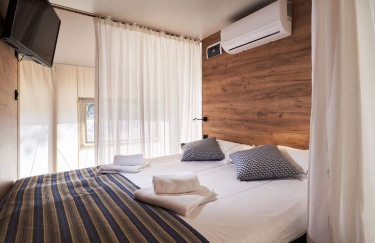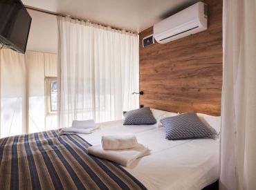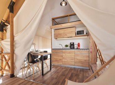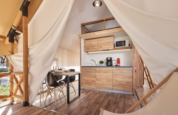 Die Family-Zelte bieten in drei Schlafzimmern Platz für bis zu sechs Personen: ein Doppelbett, ein Bett im Obergeschoss sowie ein Stockbett mit zwei Einzelbetten.