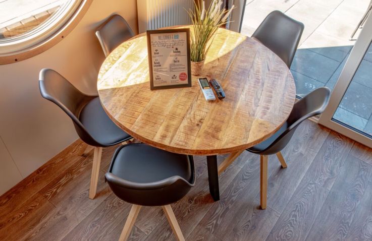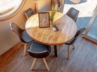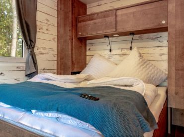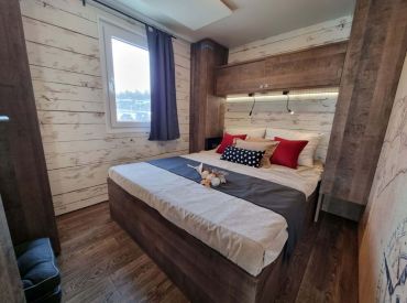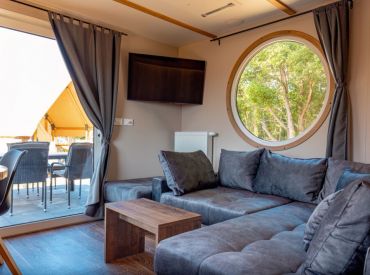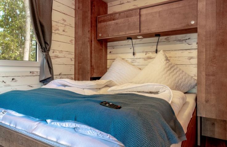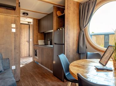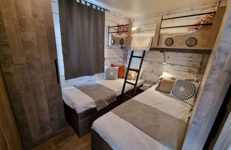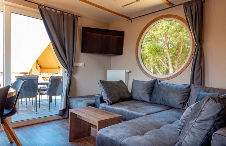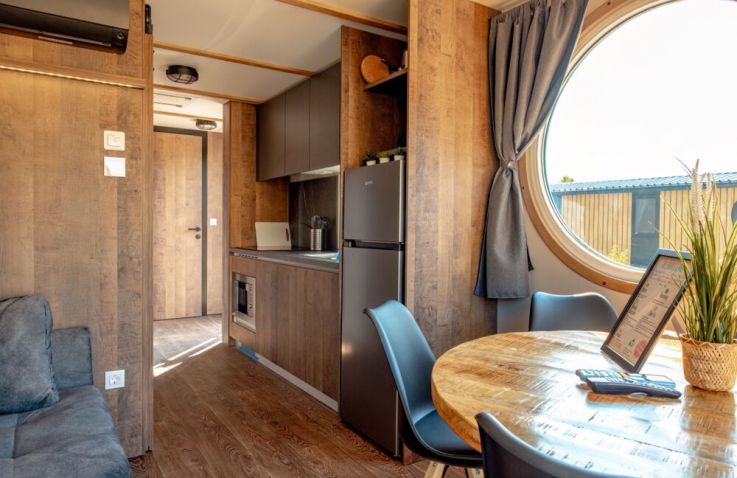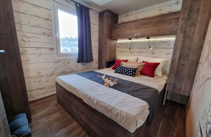 Die rund 40 m² großen Mobilheime sind im charmanten Piratenstil eingerichtet und ein besonderes Highlight für die kleinen Freibeuter! Die Mobilheime bieten Platz für zwei Erwachsene und bis zu drei Kinder. Im ersten Schlafzimmer steht ein Doppelbett bereit, im zweiten Schlafzimmer befinden sich zwei Einzelbetten sowie ein Hochbett. Zur Ausstattung gehören eine Kochnische mit zwei Herdplatten, Pfanne, Töpfe und ausreichend Geschirr, ein Kühlschrank mit Eisfach, Kaffeemaschine, Spülmaschine, Wasserkocher und Toaster. Dazu kommen Küche, Bad, Wohn- und Essbereich sowie eine Terrasse.