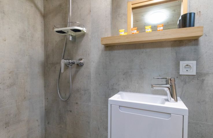 Im hellen Wohnbereich laden ein bequemer Sessel und eine Couch zum Entspannen ein. Der Fernseher sorgt für Unterhaltung, während du es dir gemütlich machst. Die moderne Küchenzeile mit Nespresso-Maschine und Essplatz ist ideal für kleine Mahlzeiten. Klimaanlage und Fußbodenheizung schaffen das ganze Jahr über eine angenehme Atmosphäre. Im separaten Schlafzimmer erwartet dich ein hochwertiges Boxspringbett mit durchgehender Matratze (160 cm breit). Für deine Erholung ist also bestens gesorgt. Das moderne Bad ist mit einer bodengleichen Dusche, WC und Waschbecken ausgestattet. Helle Fliesen, ein durchdachtes Raumkonzept und natürliche Materialien schaffen ein angenehmes Ambiente. Auf der privaten Sonnenterrasse genießt du den Blick ins Grüne, entspannst auf Loungemöbeln oder grillst bei Sonnenuntergang mit dem Elektrogrill. Der große Garten mit Lagerfeuerstelle wird gemeinschaftlich mit den Gästen der Ferienwohnungen Waldblick und Bergblick genutzt.