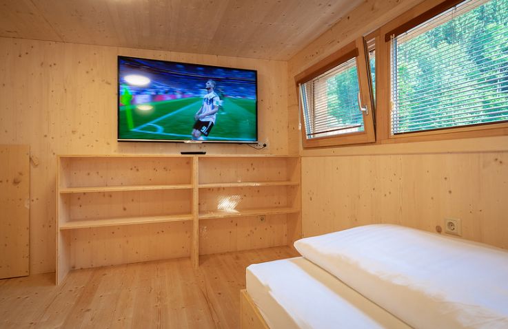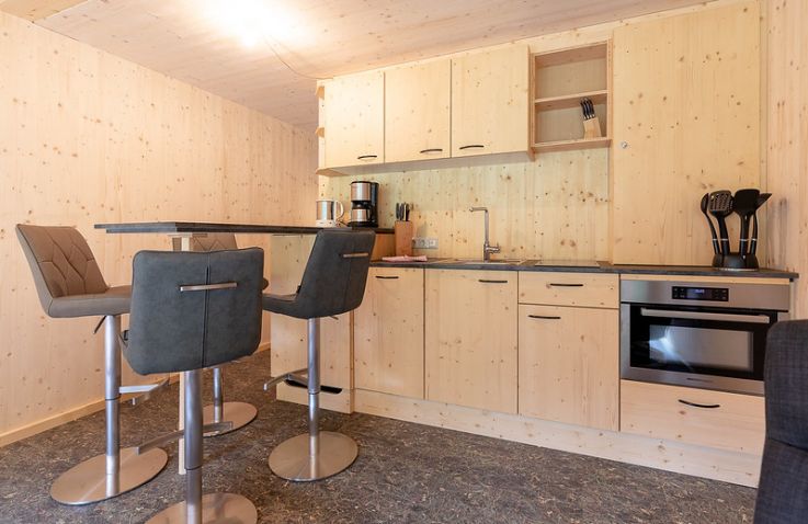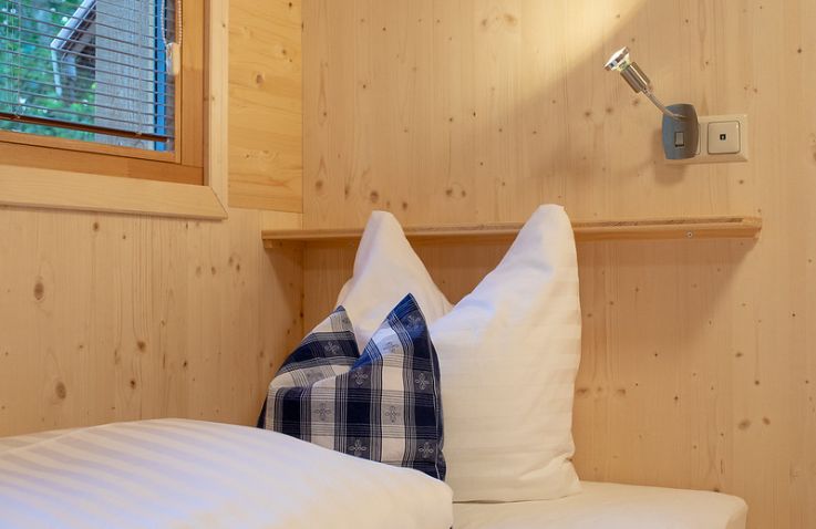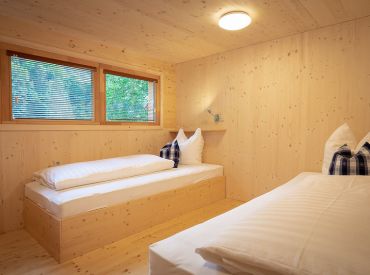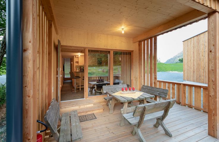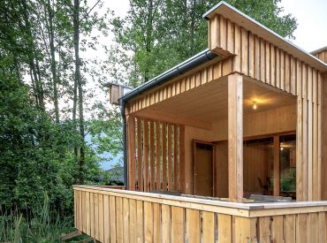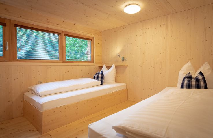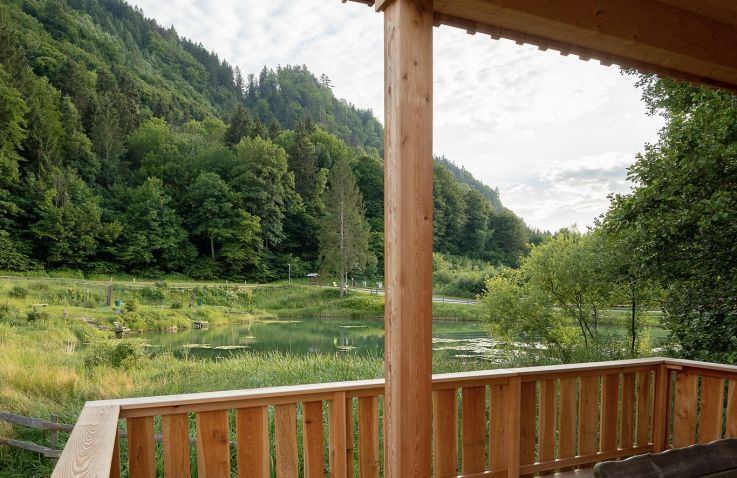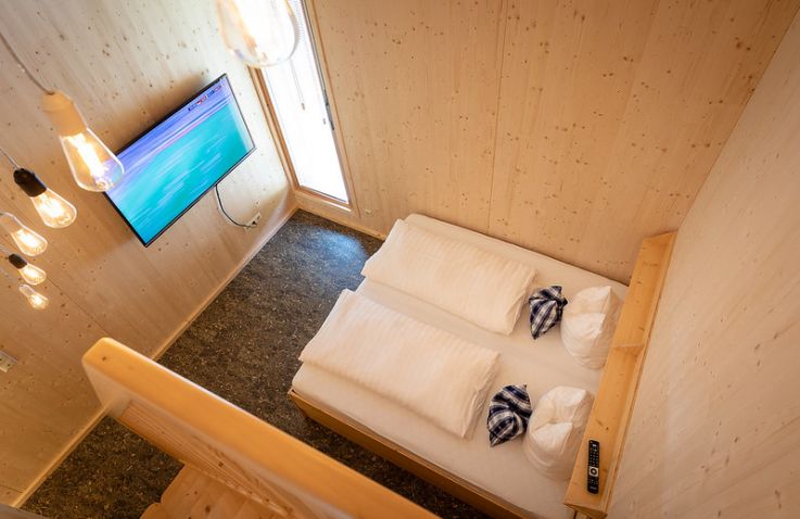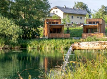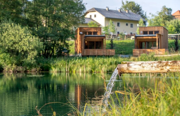 Die zwei Glamping Lodges bieten eine vollausgestattete Wohnküche mit Geschirrspüler, Herd mit Backofen/Mikrowelle, Kaffeemaschine und Wasserkocher. Bad und WC sind selbstverständlich vorhanden. Im Obergeschoss befinden sich ein Schlafzimmer sowie eine Schlafkoje mit Panoramafenster. Von der kleinen Terrasse aus genießt man den Blick auf den hauseigenen Forellenteich. Zum Baden steht das nahegelegene Strandbad Ossiach zur Verfügung, das Gäste kostenlos nutzen können.