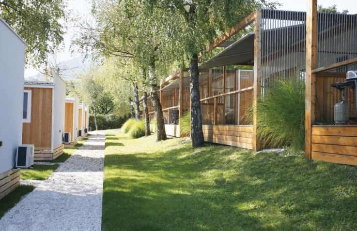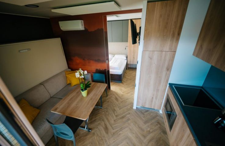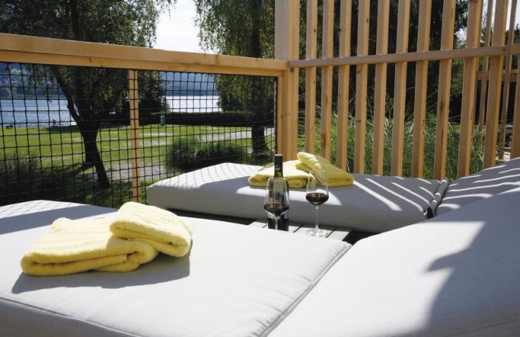 Die Camping Tiny-SeeLodge ist ein modernes Ferienhäuschen mit 20 m² Wohnfläche und verfügt über ein Schlafzimmer mit Doppelbett, ein Badezimmer mit Dusche/WC sowie einen Wohn- und Essbereich mit Doppelschlafcouch. Die voll ausgestattete Küchenzeile mit Geschirr und Kaffeemaschine ergänzt das durchdachte Raumkonzept. Auf der Terrasse mit Mobiliar, Outdoor-Liegebetten und Gasgriller genießt du entspannte Stunden im Freien.