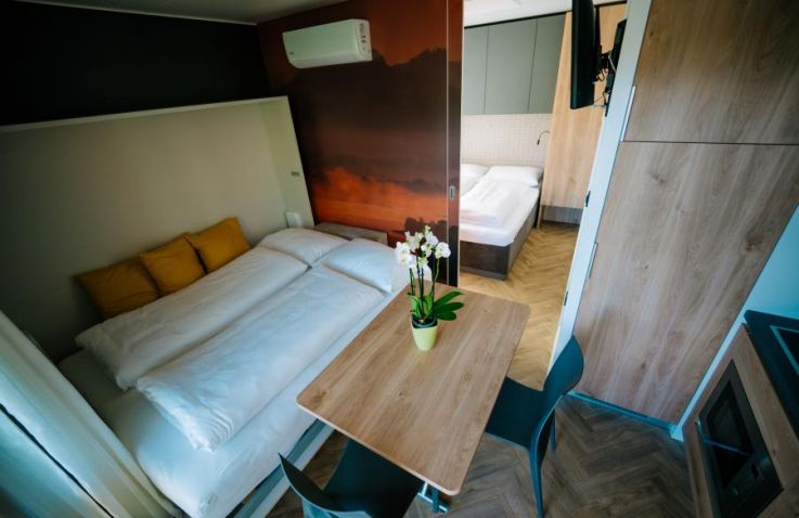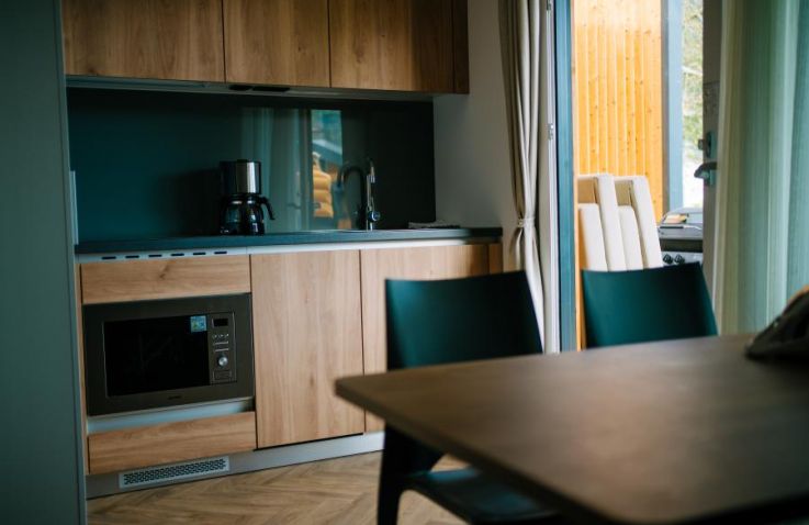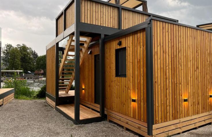 Die Lakeview-SeeLodge bietet dir auf 25 m² ein modernes Wohnkonzept in bester Lage direkt am Wasser und mit einzigartiger Rooftop-Terrasse. Dieses hochwertige Tiny House verfügt über ein Schlafzimmer, ein Badezimmer mit Dusche und WC sowie einen Wohn- und Essbereich mit komfortablem Schrankbett. Die Küchenzeile ist voll ausgestattet mit Geschirrspüler, Mikrowelle und Kaffeemachine. Das Highlight ist die großzügige Dachterrasse mit Himmelbett. Ein versperrbares Abteil für Fahrräder oder Ausrüstung ist inklusive.