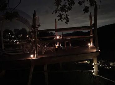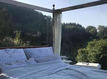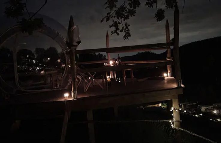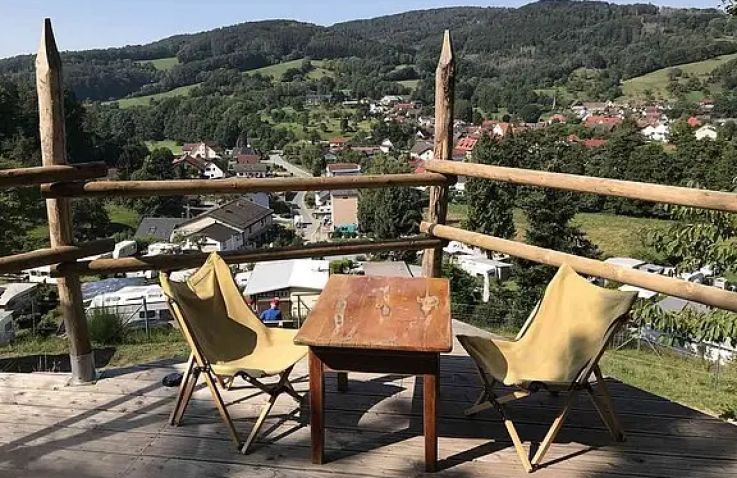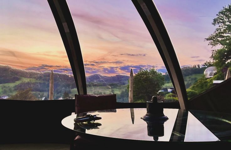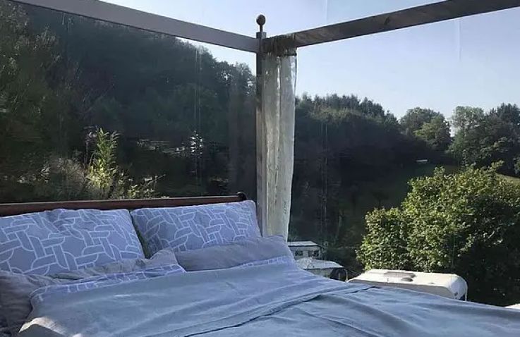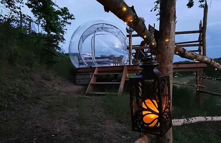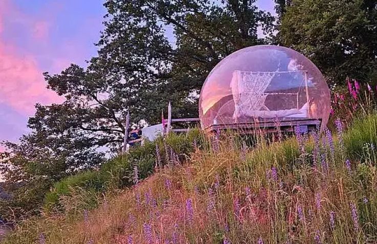 Dieses Bubble Tent thront auf dem höchsten Aussichtspunkt des ganzen Platzes mit weitem Blick ins Tal. Hintenraus befindet sich eine eingezäunte Wiese, abgetrennt mit Bäumen und Büschen. Im Innenleben befindet sich ein 1,40x2m Bett mit Bettwäsche sowie einen Tisch mit zwei Stühlen. Für mehr Privatsphäre kann die Bubble mit einem Sichtschutz verdeckt werden. Mit ihrer Lage sowie den transparenten Wänden ist sie ideal für Sternengucker und Sonnenuntergangsliebende.