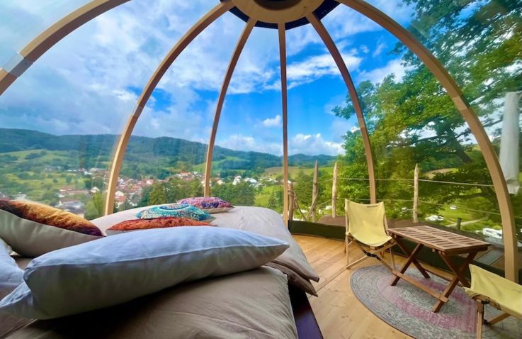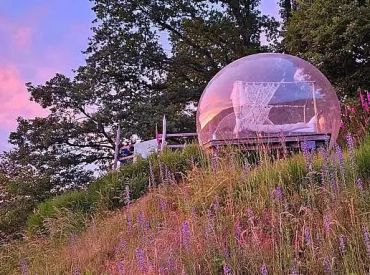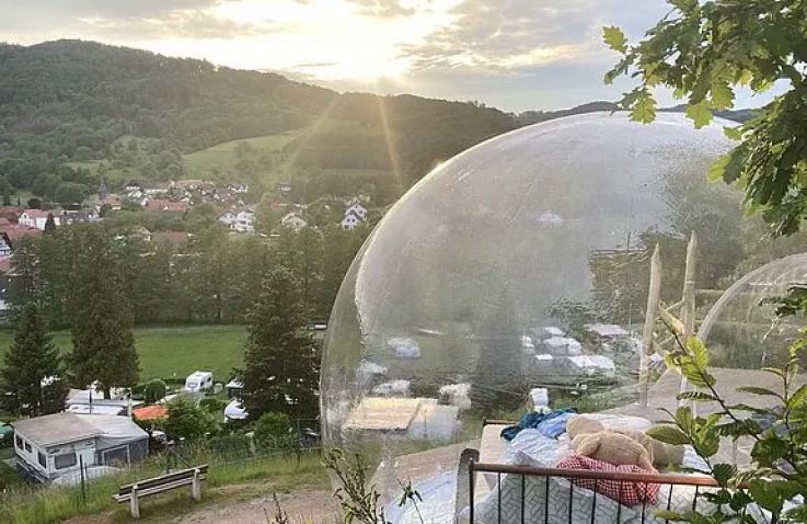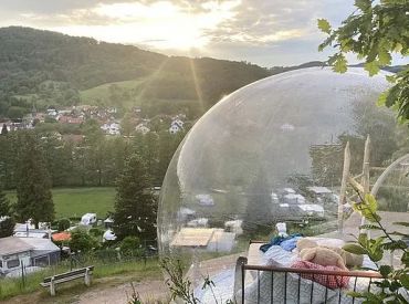Schlafen unter dem Sternenhimmel, aufwachen mit Panoramablick über den Odenwald: Die Bubble Tents des Terrassencampings Schlierbach machen Urlaub zu etwas Unvergesslichem. Hoch über dem Tal, eingebettet in Natur und Stille, verbindet diese besondere Unterkunft Komfort mit dem Gefühl, ganz nah am Himmel zu sein.