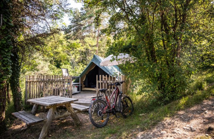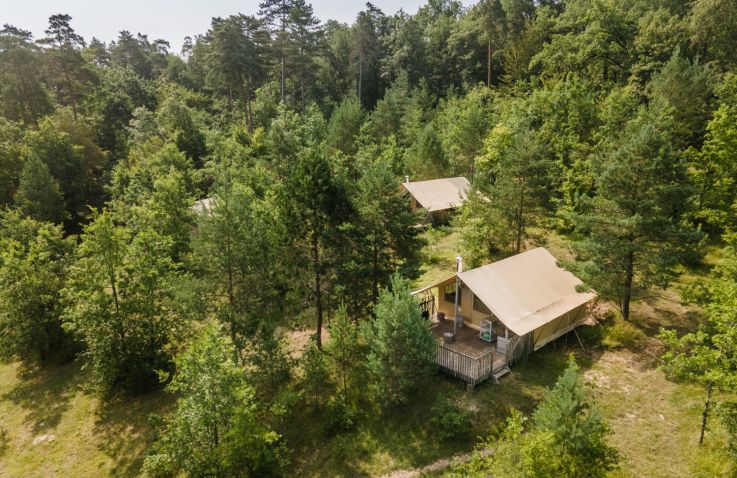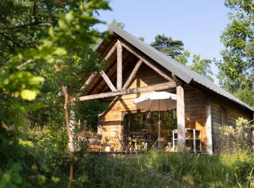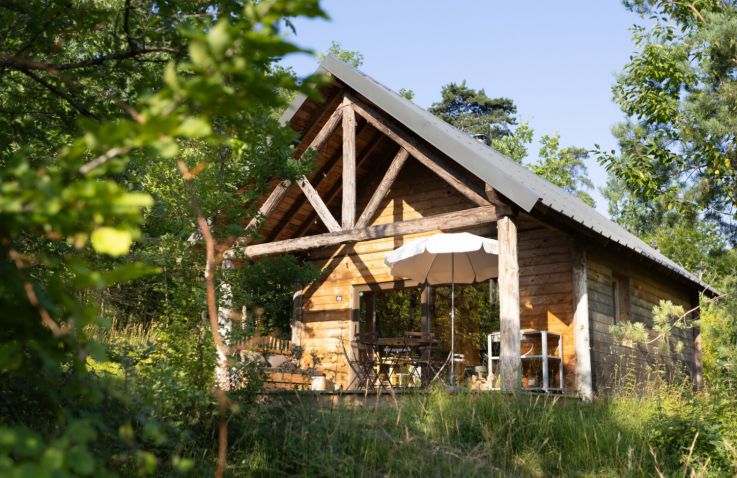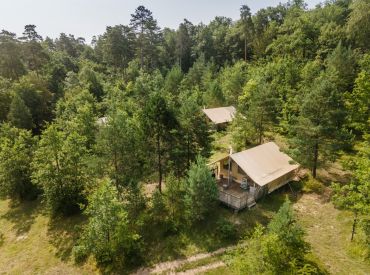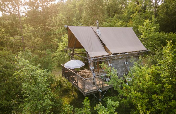 Die Cahutte ist für fünf Personen geeignet und ist eine Kombination aus komfortabler Hütte auf Pfeilern und einem Zelt darüber. Die Schlafplätze befinden sich alle unter der Plane im Obergeschoss. Im Erdgeschoss gibt es eine Küchenzeile, einen Essbereich und ein Badezimmer mit Dusche und WC. Die große Terrasse im Freien ist möbliert.