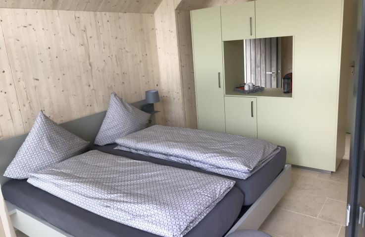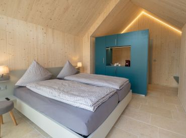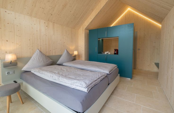 Das charmante Räbhüüsli bietet auf großzügiger Grundfläche Platz für zwei Personen und verbindet traditionelle Schweizer Bauweise mit zeitgemäßem Design. Die Unterkunft verfügt über ein komfortables Doppelbett, ein eigenes Badezimmer mit Dusche und WC sowie eine private, möblierte Terrasse mit Gartenblick. Moderne Annehmlichkeiten wie WLAN, Fernseher und USB-Anschlüsse sorgen für zeitgemäßen Komfort, während der Kaffee à discrétion jederzeit zur Verfügung steht. Im Preis inbegriffen ist ein reichhaltiges Frühstück, das dich perfekt für einen erlebnisreichen Tag stärkt. Die Ausstattung mit hochwertigen Materialien und die durchdachte Raumaufteilung machen längere Aufenthalte zum Genuss.