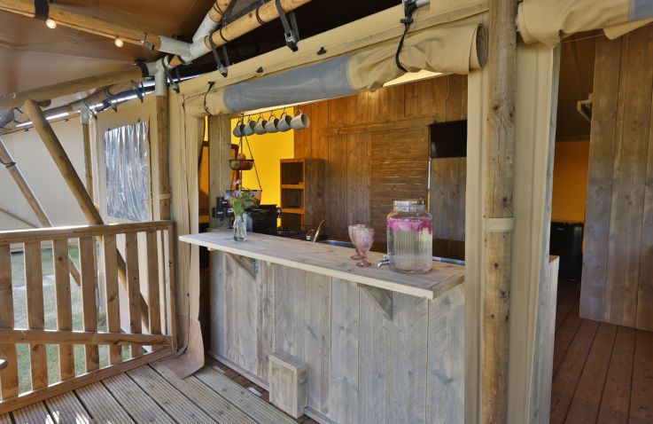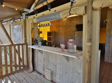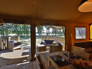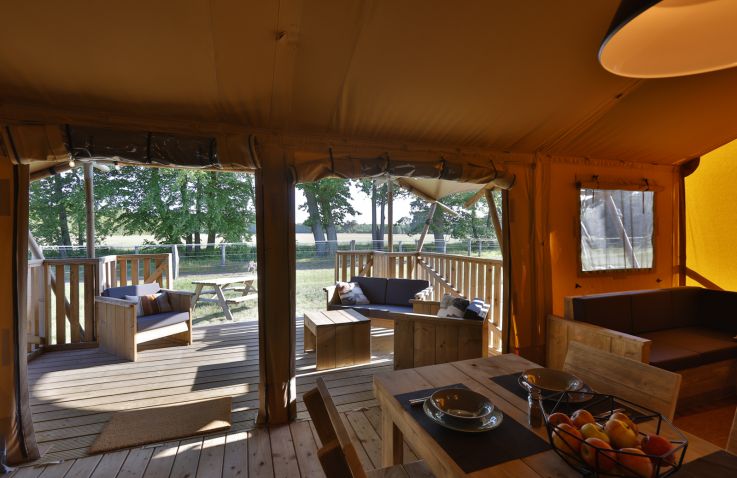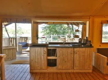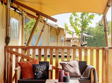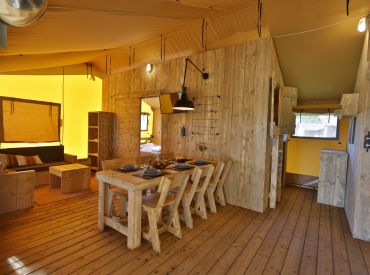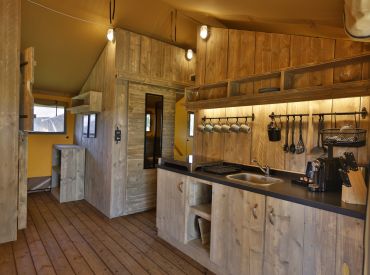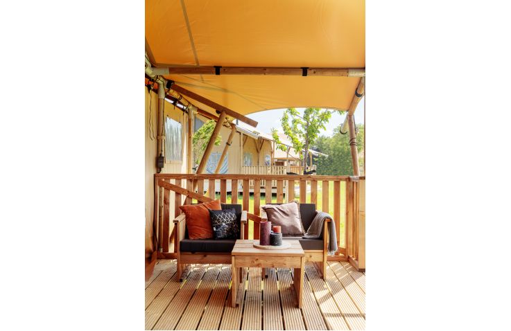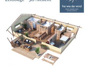 Die Zeltlodge III ist auf 65 m² speziell auf Familien mit Kindern zugeschnitten und bietet Platz für bis zu vier Erwachsene und zwei Kinder. Neben zwei Schlafzimmern, einem mit Kingsize-Bett und einem mit zwei Einzelbetten, wartet ein besonderes Highlight auf die kleinen Gäste: ein Hochbett für zwei Kinder bis etwa zwölf Jahren mit einem darunterliegenden Spielzimmer, das zum Toben und Entdecken einlädt. Die 15 m² überdachte Terrasse bietet auch bei wechselhaftem Wetter einen geschützten Rückzugsort für die ganze Familie.