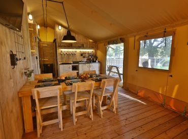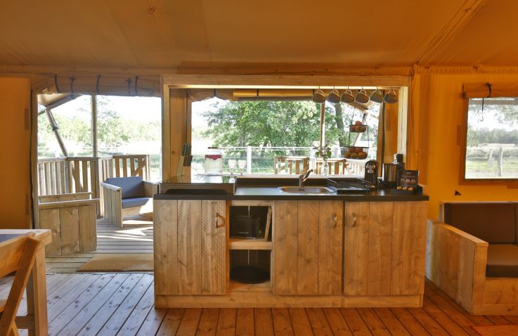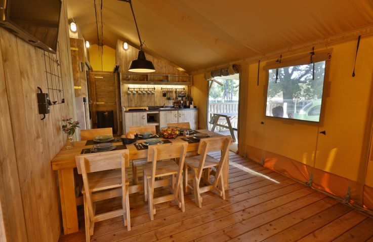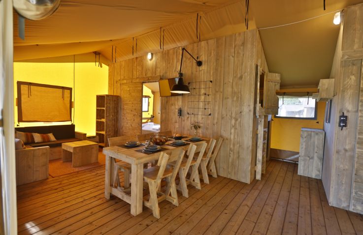 Die Zeltlodge I bietet auf großzügigen 65 m² Platz für bis zu sechs Erwachsene und ist damit ideal für größere Familien oder Freundesgruppen. Drei separate Schlafzimmer sorgen für maximale Privatsphäre: ein Hauptschlafzimmer mit komfortablem Kingsize-Bett sowie zwei weitere Schlafzimmer mit jeweils zwei Einzelbetten. Die 15 m² überdachte Terrasse lädt zum entspannten Verweilen ein, egal ob beim Frühstück mit Meerblick oder beim gemütlichen Beisammensein am Abend, geschützt vor Wind und Wetter.